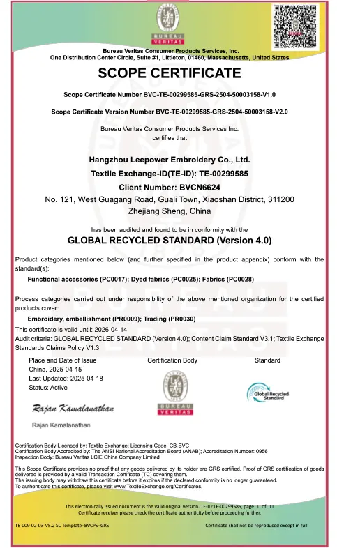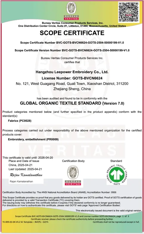 LeePower Embroidery is with GRS and GOTS Certificates. Our dying Factories are with OEKO-TEX STANDARD100, We are using Sustainable materials with GOT Certificate, GRS Certificate, OCS Certificate.