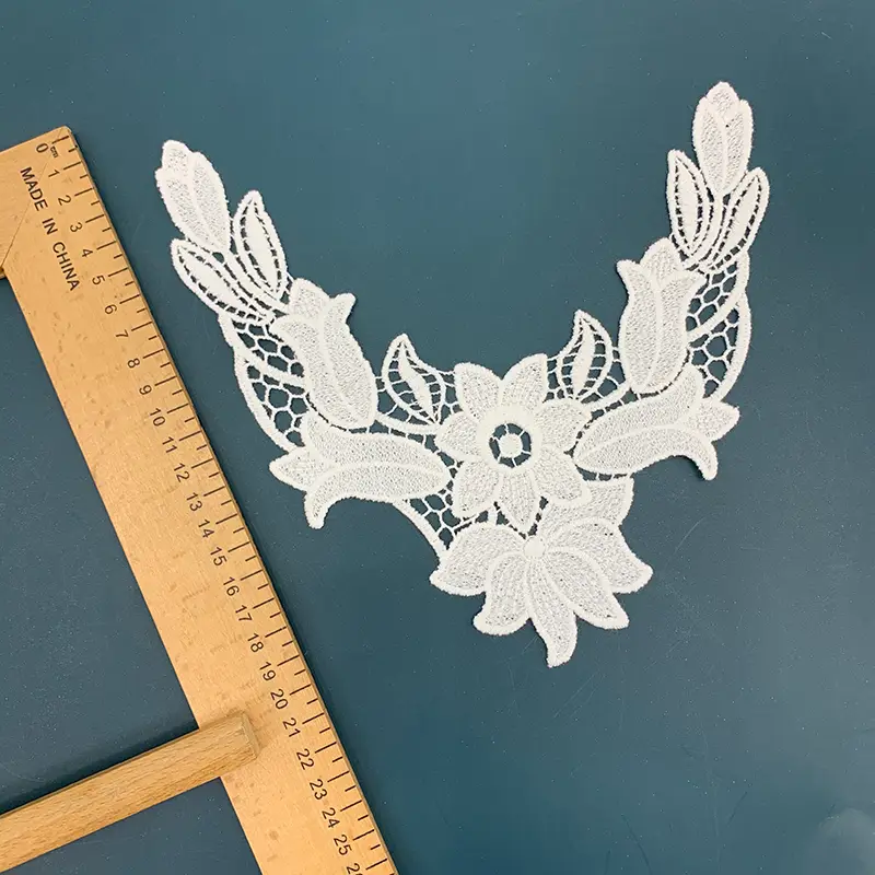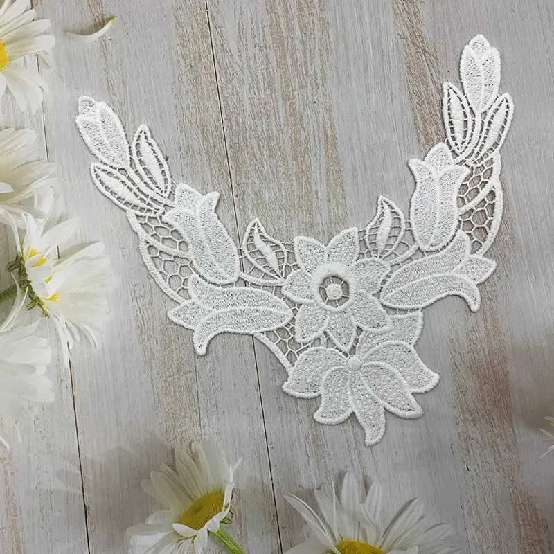 This ivory white water-soluble embroidered collar applique, sized at 19CM by 21CM, showcases a refined floral motif with tulip and daisy-inspired blooms and delicately connected leaves. The symmetrical pattern and solid embroidery add a sense of structure and grace, while the connection grids ensures breathability and lightness—perfect for enhancing the neckline of garments with intricate detail.