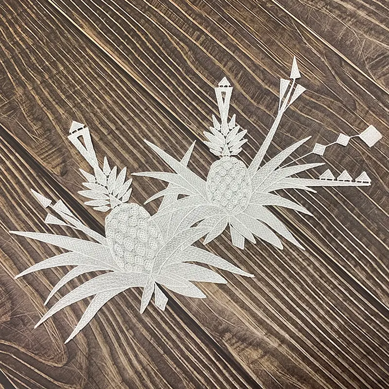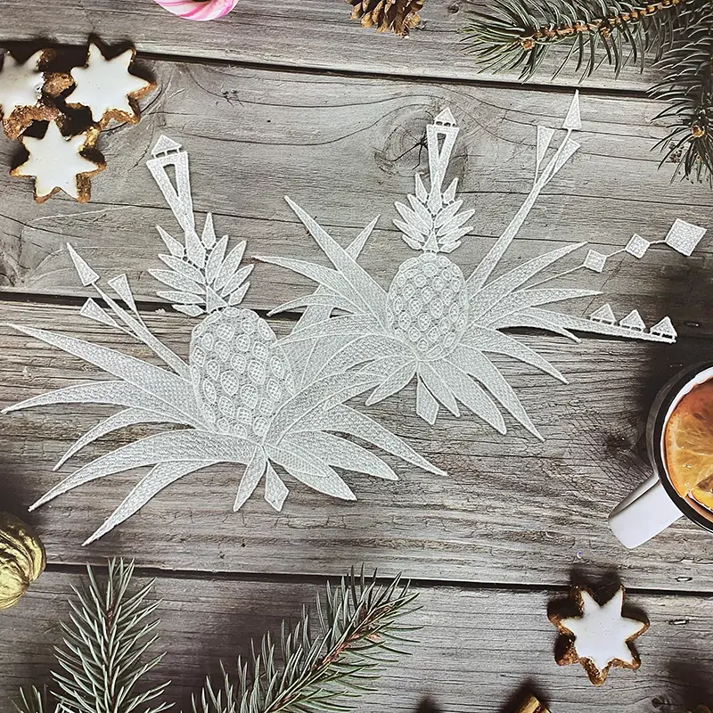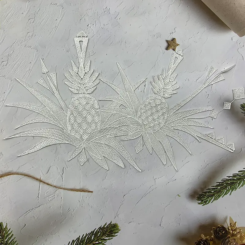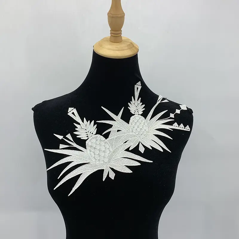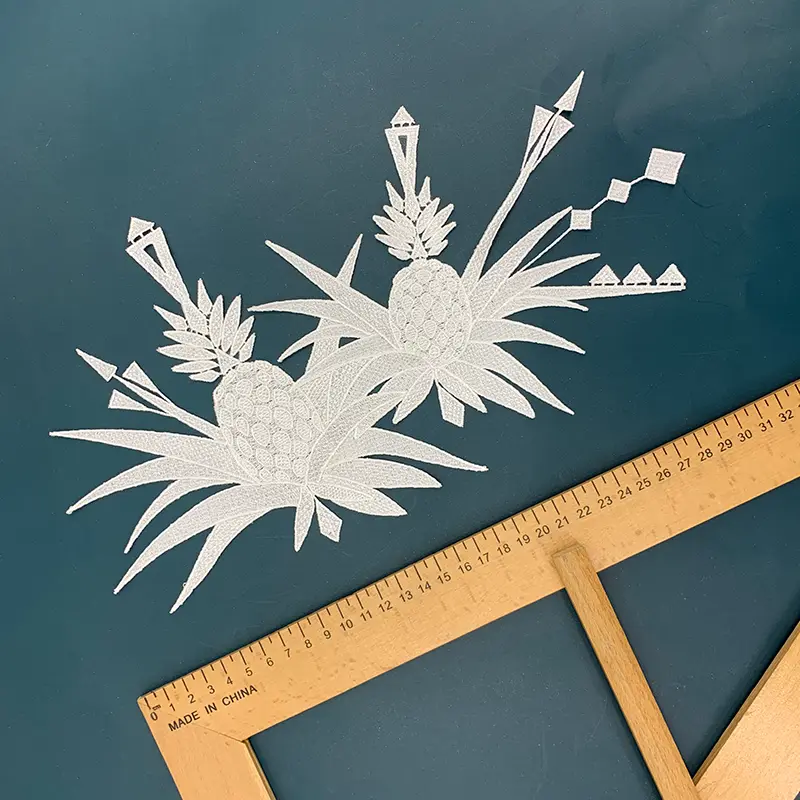 This 34CM x 27CM natural cotton thread water-soluble embroidered applique features a bold and artistic pineapple motif, crafted with intricate embroidery details and sharp geometric accents. The layered leaves and structured fruit forms give it a dynamic, tropical character that feels both playful and modern, making it a standout design choice.