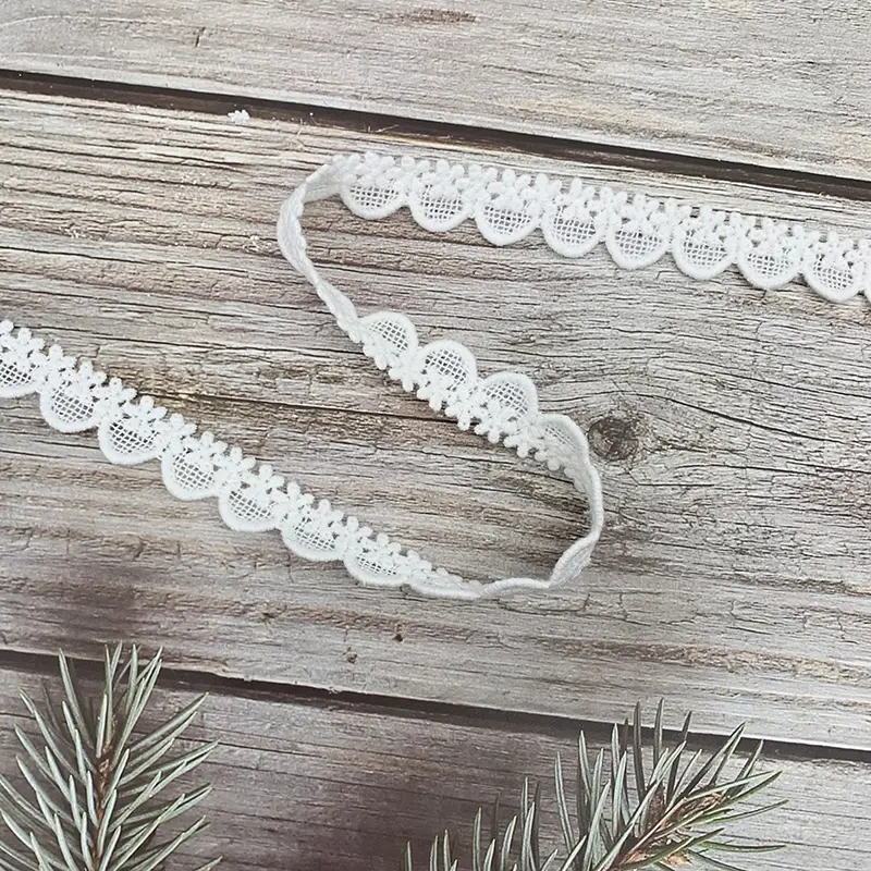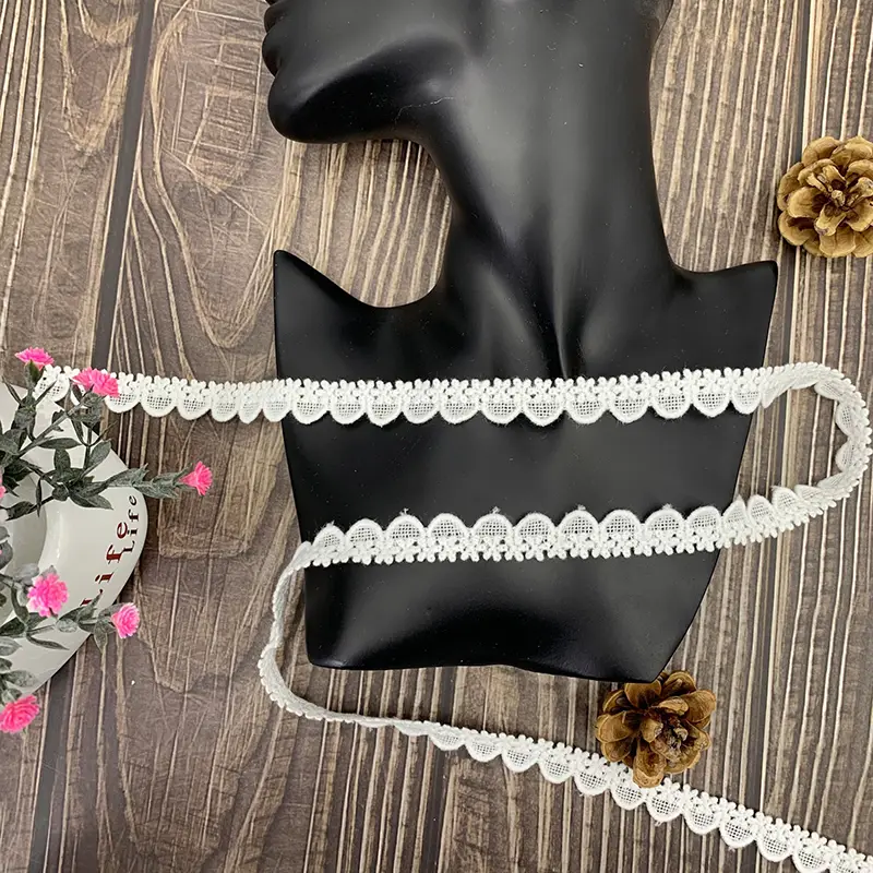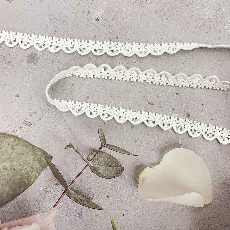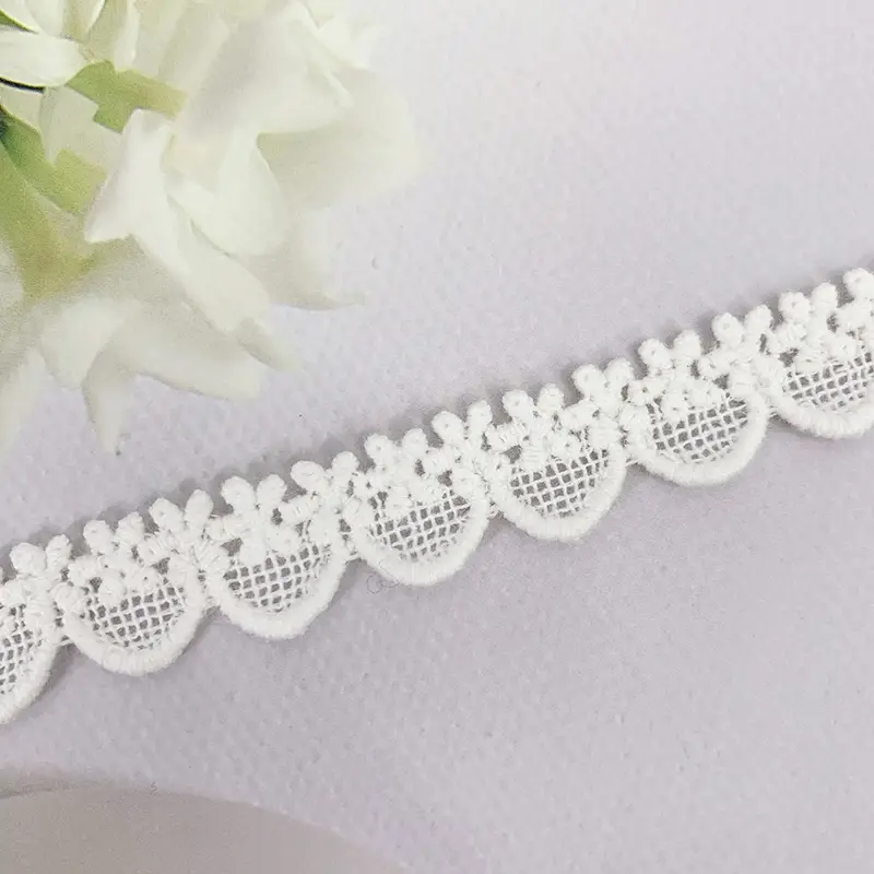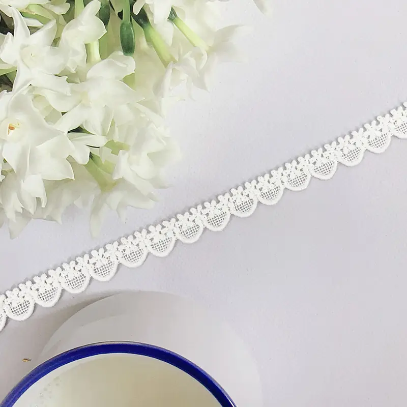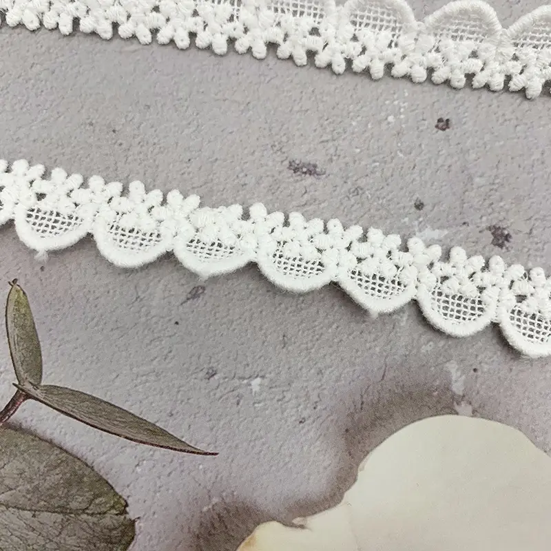 This 1.5CM white polyester water-soluble lace features a delicate scalloped pattern combined with fine lattice details and subtle floral accents. The lightweight, intricate design offers a clean, elegant finish, making it ideal for refined and minimalist fashion aesthetics. Crafted with precision, this lace showcases a perfect balance between structure and softness, providing excellent durability and a soft hand feel.