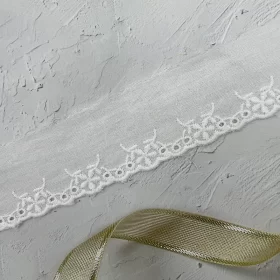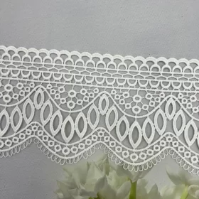 This 1CM white cotton water-soluble lace trim showcases a delicate and refined scalloped design, crafted with exquisite embroidery techniques. The soft cotton thread ensures a comfortable touch while maintaining the lace’s lightweight and breathable qualities. Its intricate pattern offers a classic yet versatile aesthetic, making it an ideal embellishment for elevating the sophistication of garments and accessories.