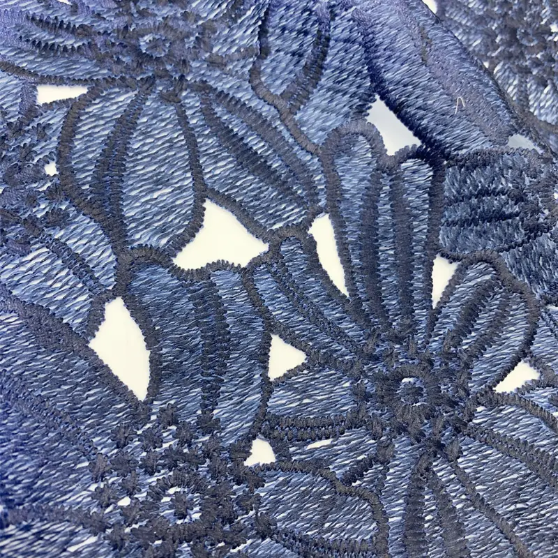 This fabric features a delicate floral embroidery crafted with polyester milk yarn on a water-soluble base. The digital print transitions from intricate, three-dimensional flowers in deep navy at the hem to softer floral prints in pastel tones, offering a beautiful gradient effect. The exquisite detailing and clear cutwork add a refined touch, making the pattern both vivid and luxurious.