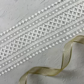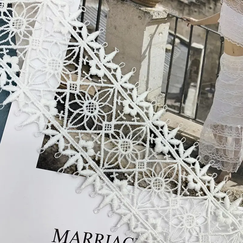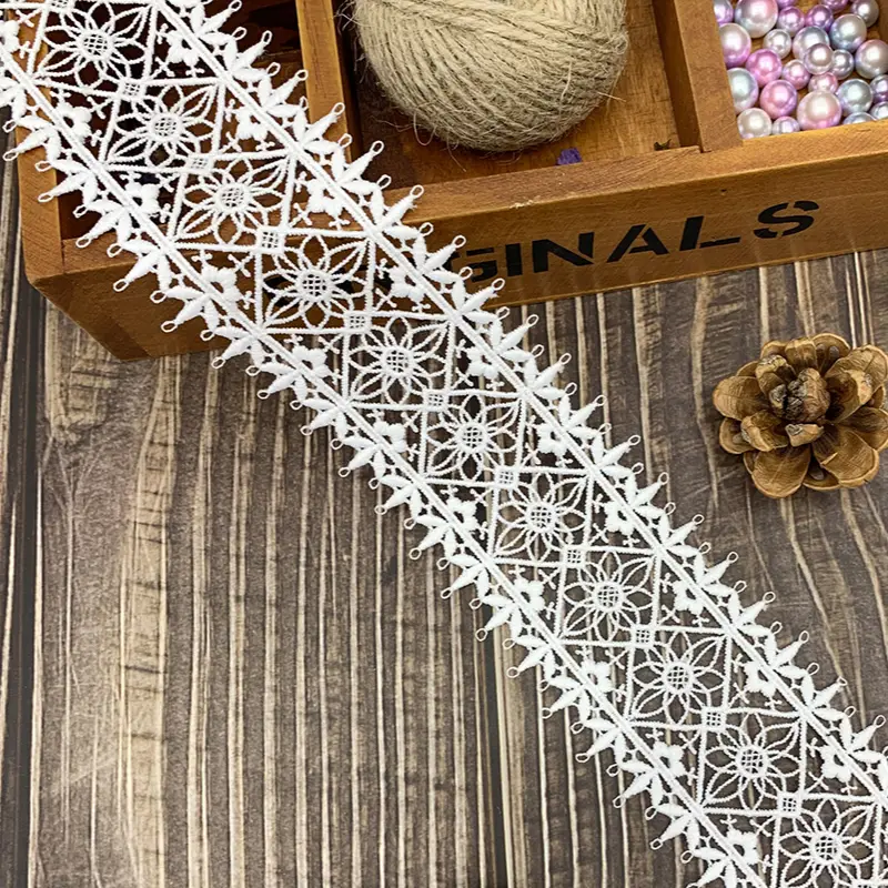 This 5.5CM white milk yarn water-soluble lace features an intricate, geometric floral pattern that balances delicacy and structure. The detailed cutwork and symmetrical motif enhance its elegance, making it a standout trim that brings both sophistication and refinement to any design. Crafted with precision, the lace offers a luxurious texture with a slightly raised embroidery, delivering a tactile richness that elevates its visual appeal.