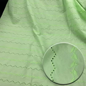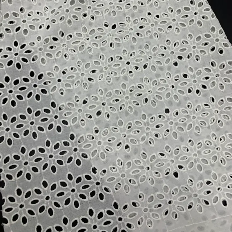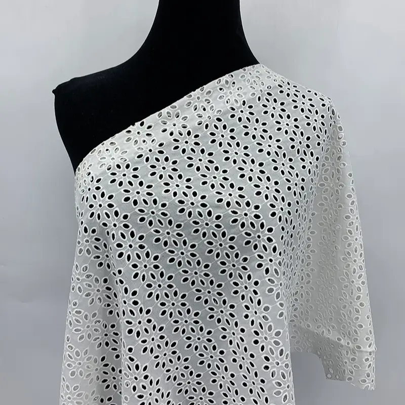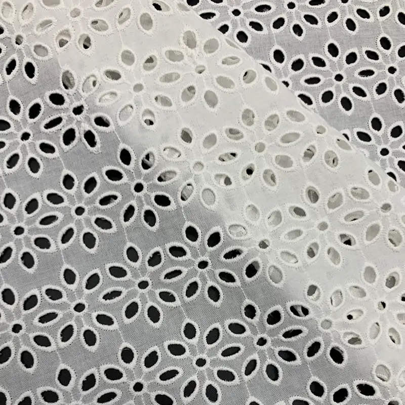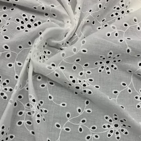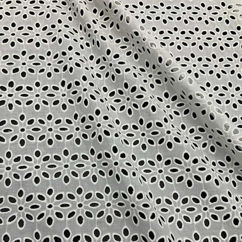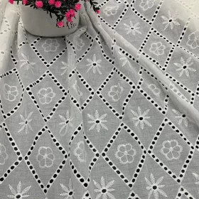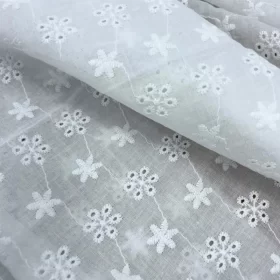 This white cotton embroidery fabric features a neatly arranged floral eyelet design, combining delicate petal-like cutouts with crisp stitching for a refined, airy look. The uniform pattern layout adds a sense of order and elegance, making it ideal for clean-lined, modern silhouettes.