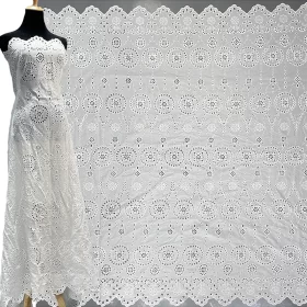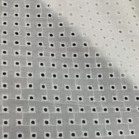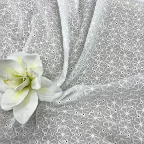 This white cotton embroidery fabric features a neatly arranged floral eyelet design, combining delicate petal-like cutouts with crisp stitching for a refined, airy look. The uniform pattern layout adds a sense of order and elegance, making it ideal for clean-lined, modern silhouettes.