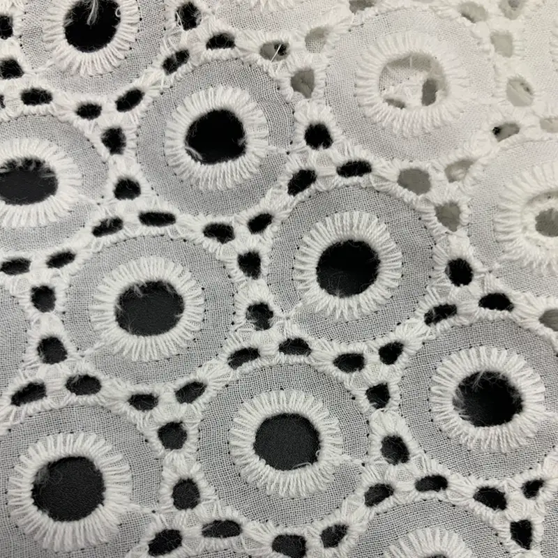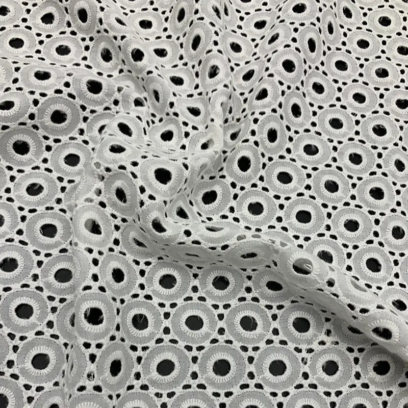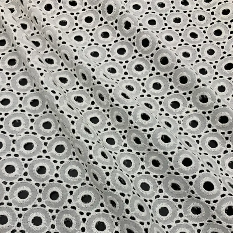 This crisp white cotton fabric features a modern geometric design with densely arranged circular eyelet embroidery. The precise cutwork and clean stitched rings create a bold yet minimal aesthetic, perfect for adding texture and breathability to any garment.