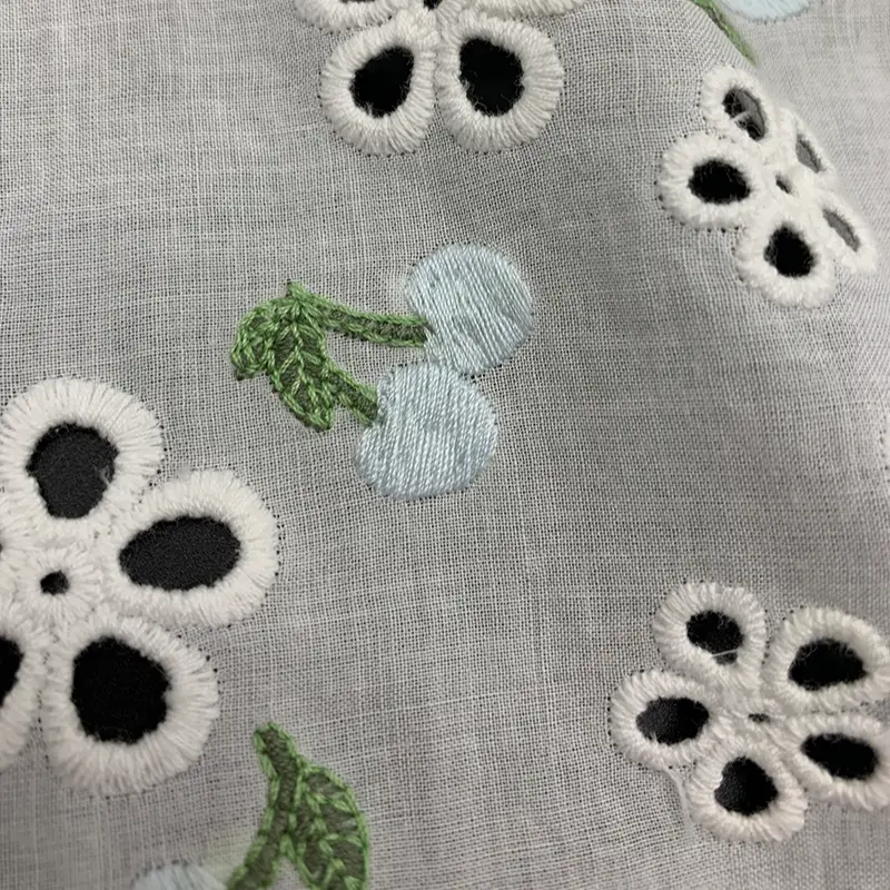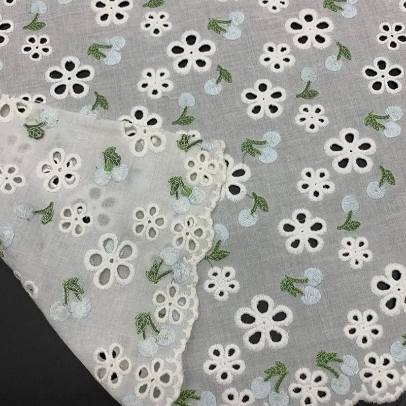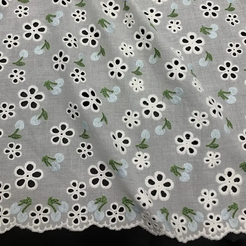 This charming white cotton eyelet fabric features playful multicolor embroidery with delicate cherry and daisy motifs. The design is crafted with fine cutwork details and a scalloped border, bringing a whimsical yet polished look.