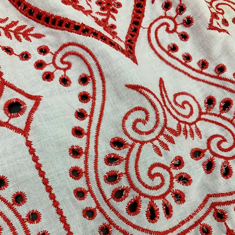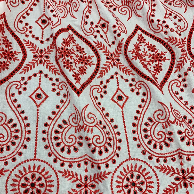 This eye-catching embroidered cotton fabric features bold red threadwork on a crisp white base, combining intricate floral and paisley-inspired motifs with precise eyelet detailing. The symmetrical layout and scalloped hem add a refined finish, making the fabric both decorative and breathable.