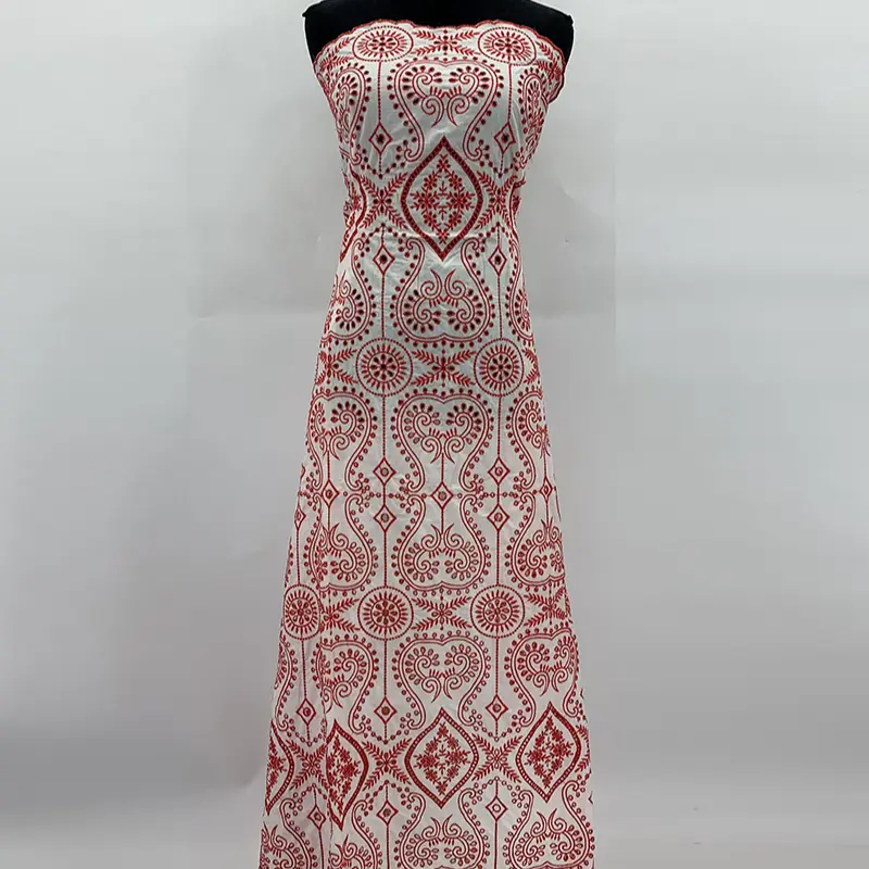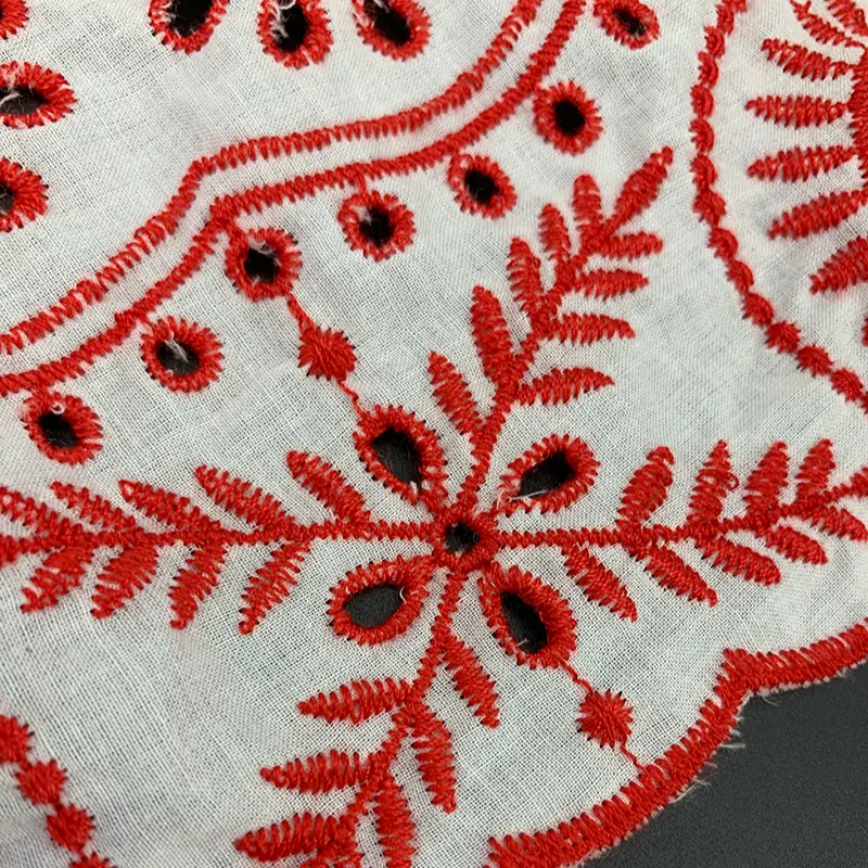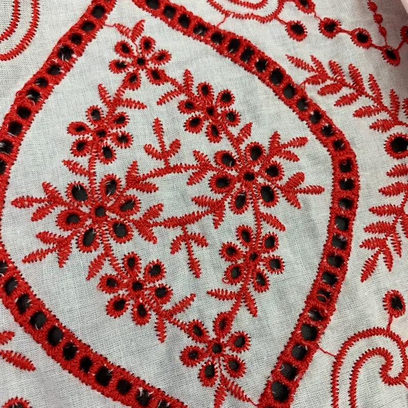 Hot Sale Design Red/White Vintage Style Floral Cotton Eyelet Cotton Embroidered Lace Fabric with Scalloped Edges for Women Dress.