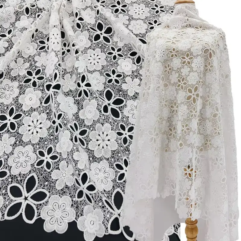 Hot Sale Ivory White Polyester Floral Embroidery Lace Fabric for Lady Dress.