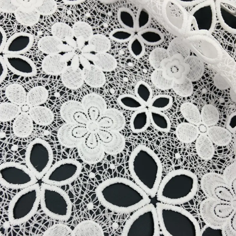 This white polyester water-soluble lace features a charming combination of flower motifs with circular and petal shapes. The detailed embroidery is carefully crafted, creating a balanced and airy pattern, making it ideal for designs requiring intricate detailing and a touch of sophistication.