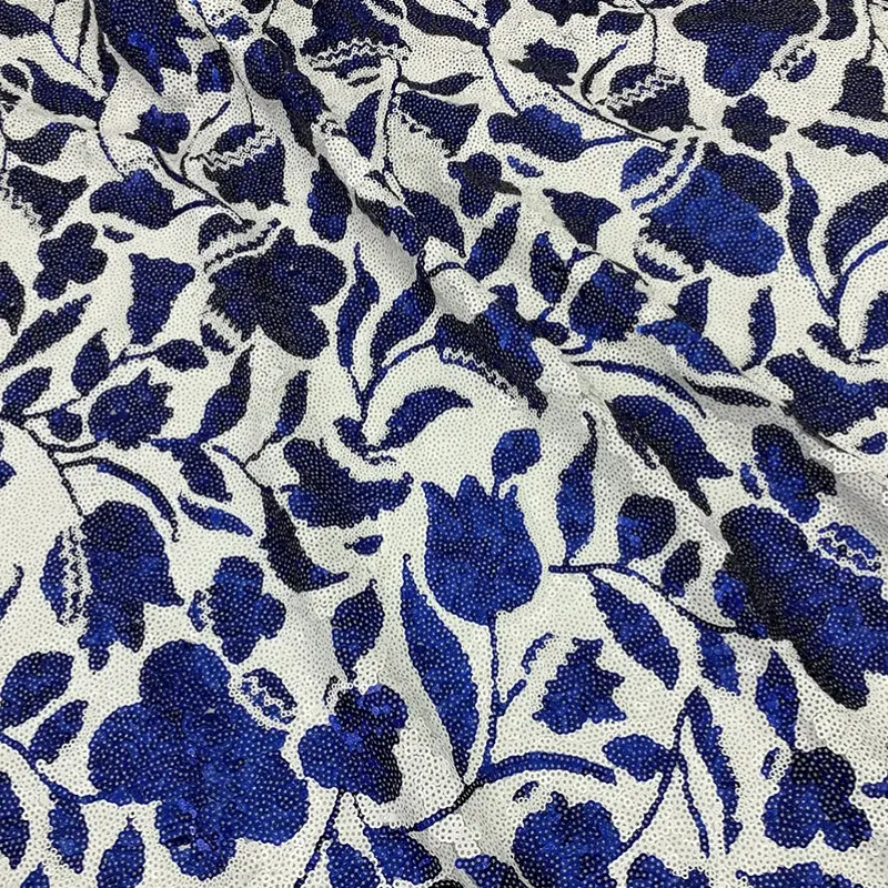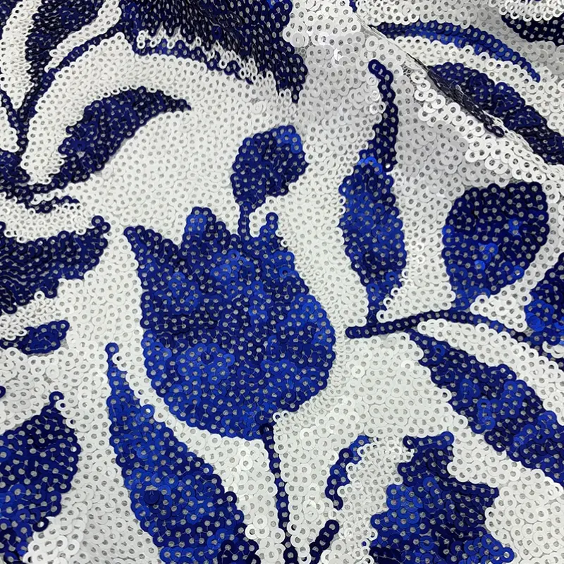 This elegant sequin embroidered mesh fabric features a striking white base adorned with cobalt blue tulip-inspired floral motifs, reminiscent of traditional Chinese cloisonné (Jingtailan) art. The intricate floral pattern is densely embroidered with shimmering sequins, giving the fabric a luxurious texture and a captivating light-reflective effect.