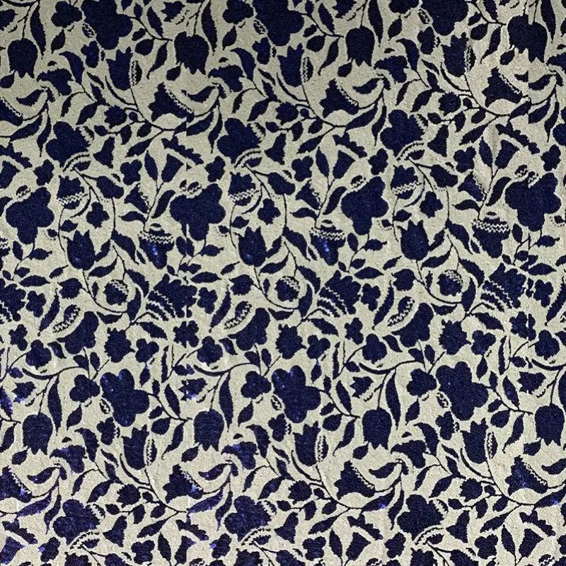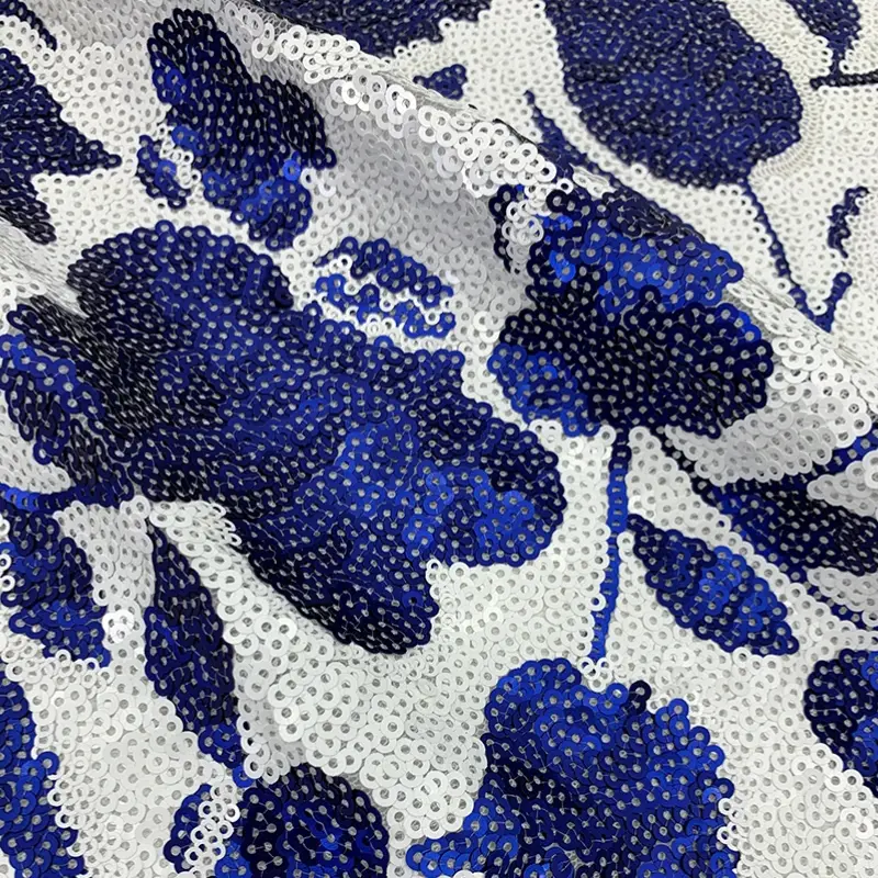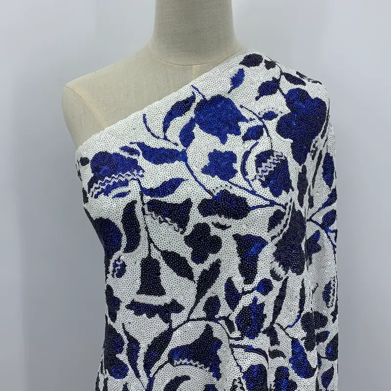 Factory Direct Luxury Floral Pattern White/ Blue 3MM Sequin Embroidery Mesh Lace Fabric.