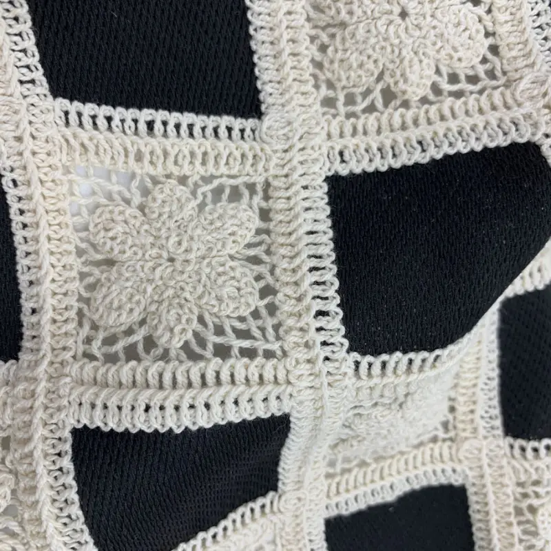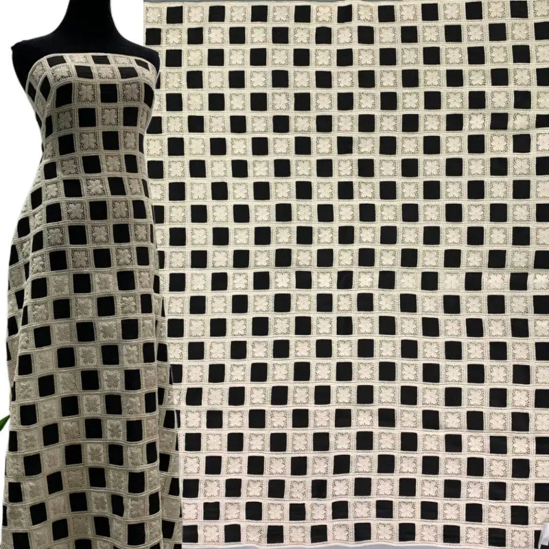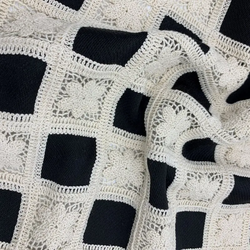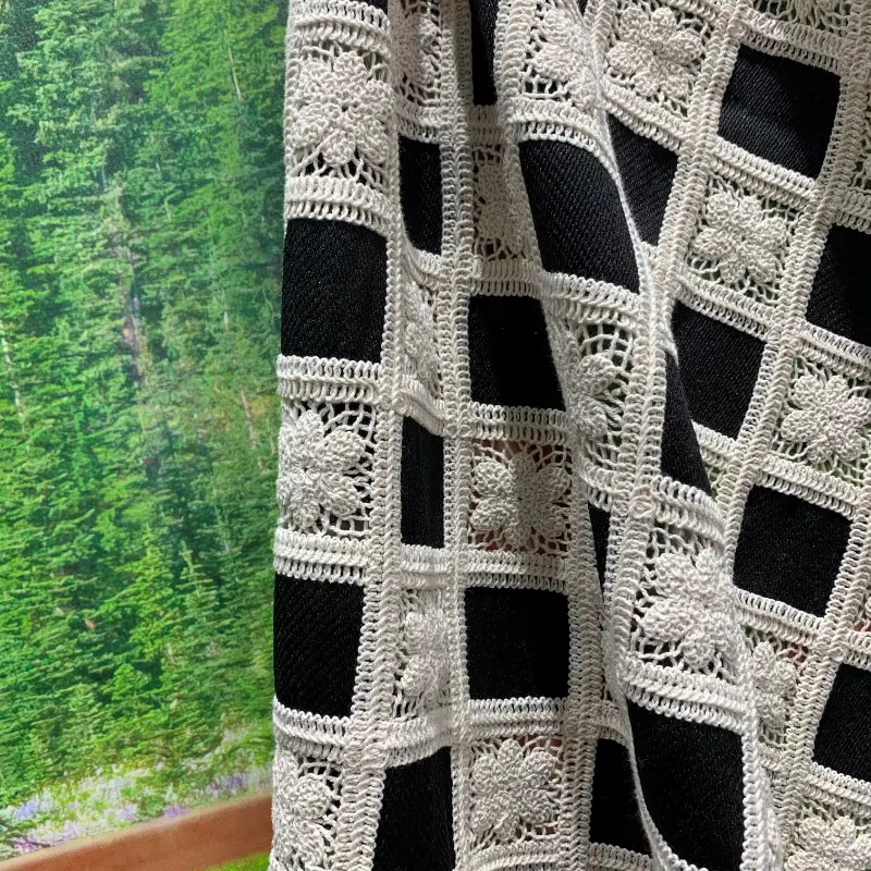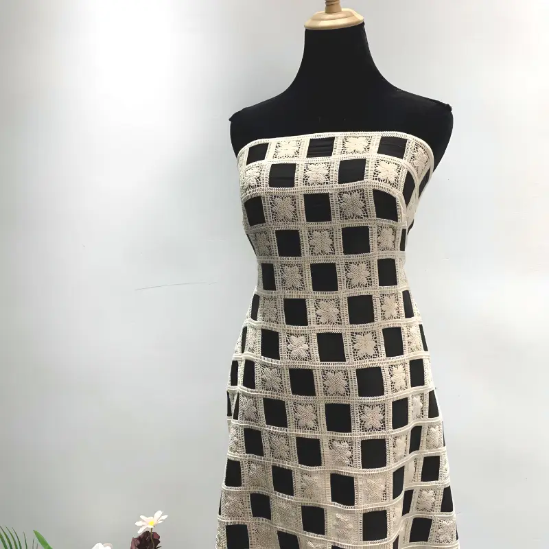 This striking fabric showcases a checkerboard pattern composed of alternating black blocks and natural-colored floral guipure lace squares. Each lace square is delicately embroidered with cotton thread, forming intricate floral motifs that add a handcrafted, textural charm. The bold black contrast enhances the visual impact, creating a modern-retro aesthetic.