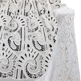 With its structured body and slight drape, this fabric is perfect for statement garments that hold their shape while offering comfort and breathability. The water-soluble technique leaves a clean, lace-cut finish that gives each square refined definition, idea for making high-impact dresses and skirts, retro-inspired suits and jackets, statement tops and outerwear etc.