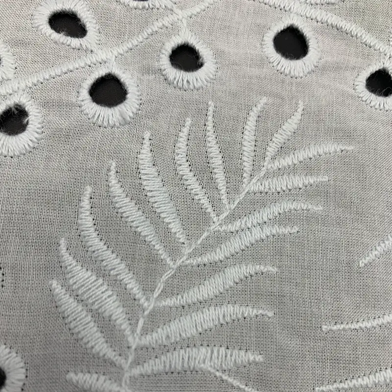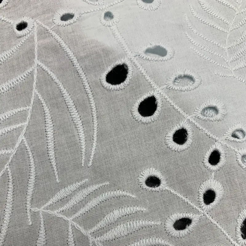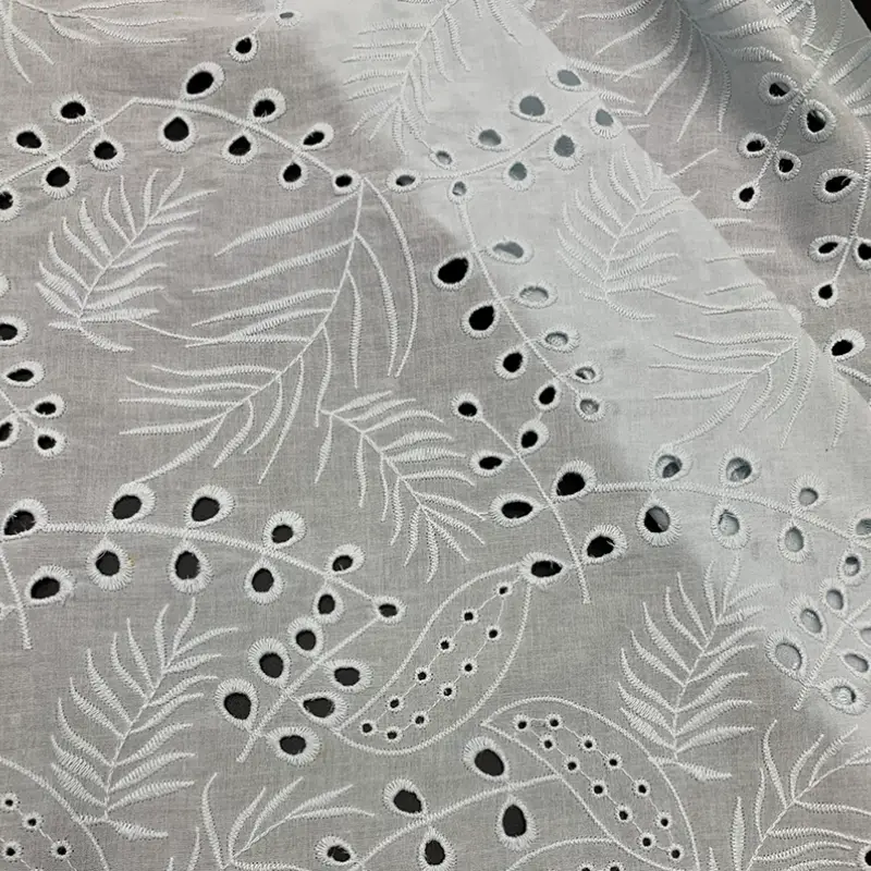 This fabric showcases an elegant botanical embroidery design featuring finely stitched leaf motifs with delicate teardrop-shaped eyelets. The pattern is thoughtfully spaced to balance coverage and breathability, adding a sophisticated yet airy look.
