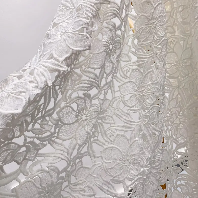 The fabric has a soft yet structured drape that adds volume without stiffness. Its breathable composition ensures comfort, while the water-soluble technique creates a fine, lace-like texture with a luxurious hand feel.