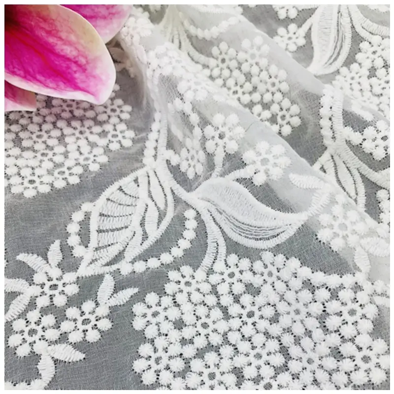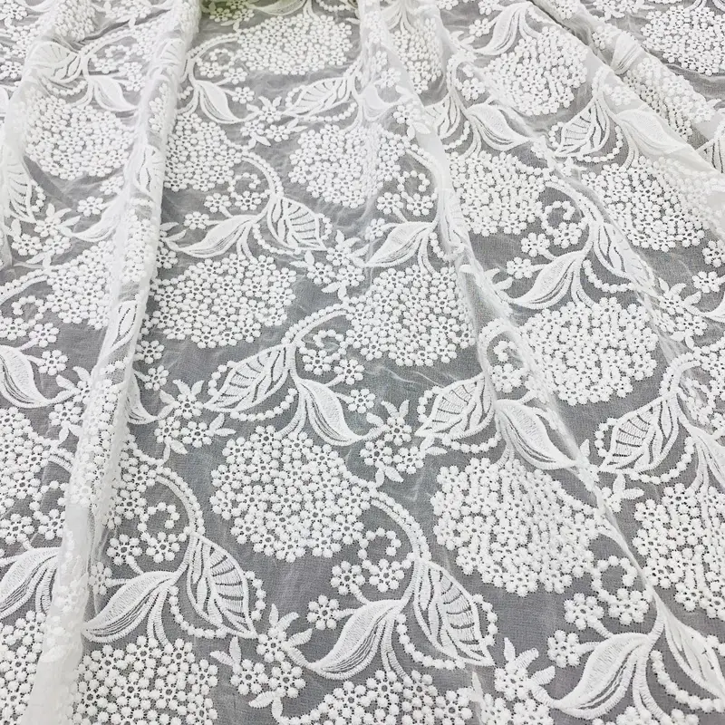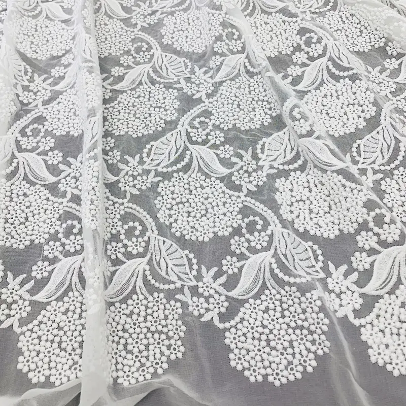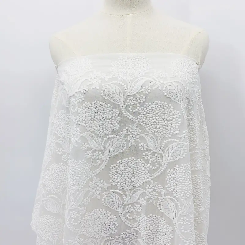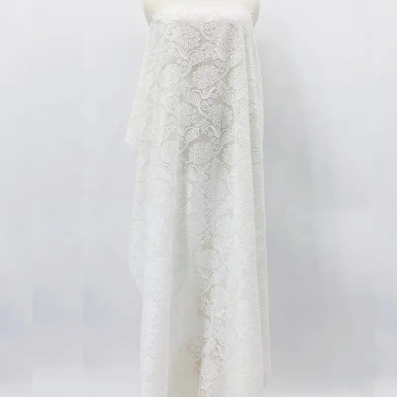 Manufacturer Wholesale Ivory White Polyester Floral Embroidered Chiffon Fabric for Bridal Dress.
