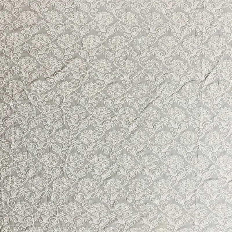 This elegant white chiffon embroidery fabric showcases a beautifully dense floral pattern made of fine white threads, evoking a sense of delicacy and refinement. The clustered flower motifs are artistically arranged with flowing leafy vines, creating a rhythmic, organic layout that feels both delicate and romantic.
