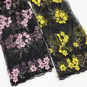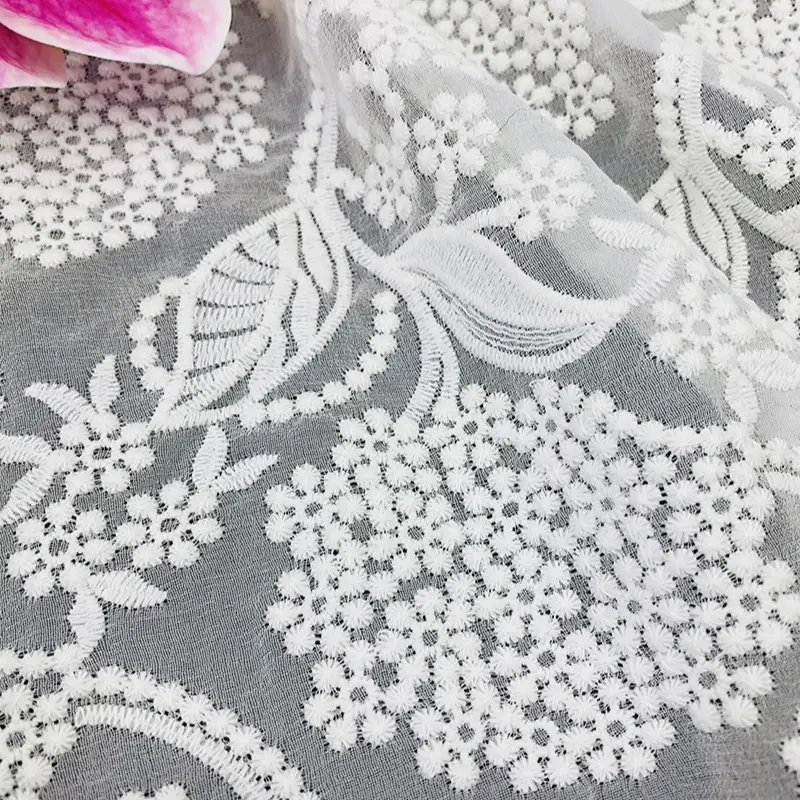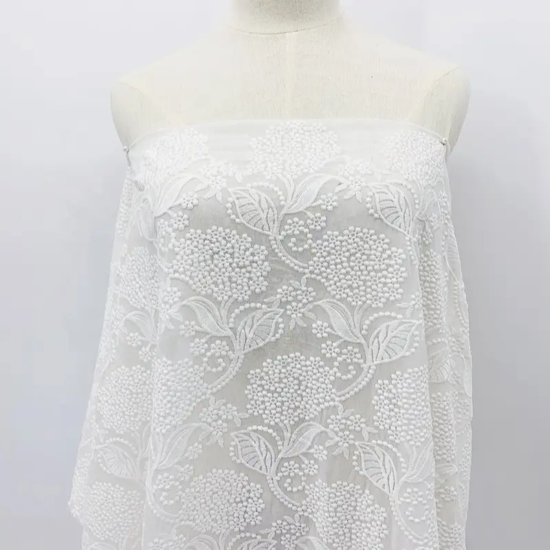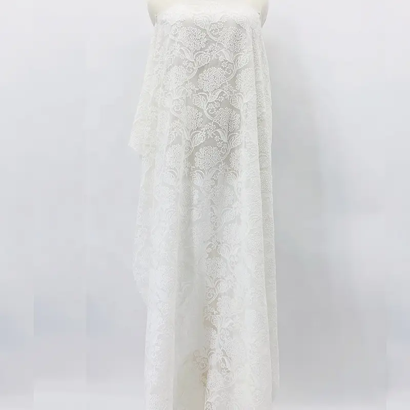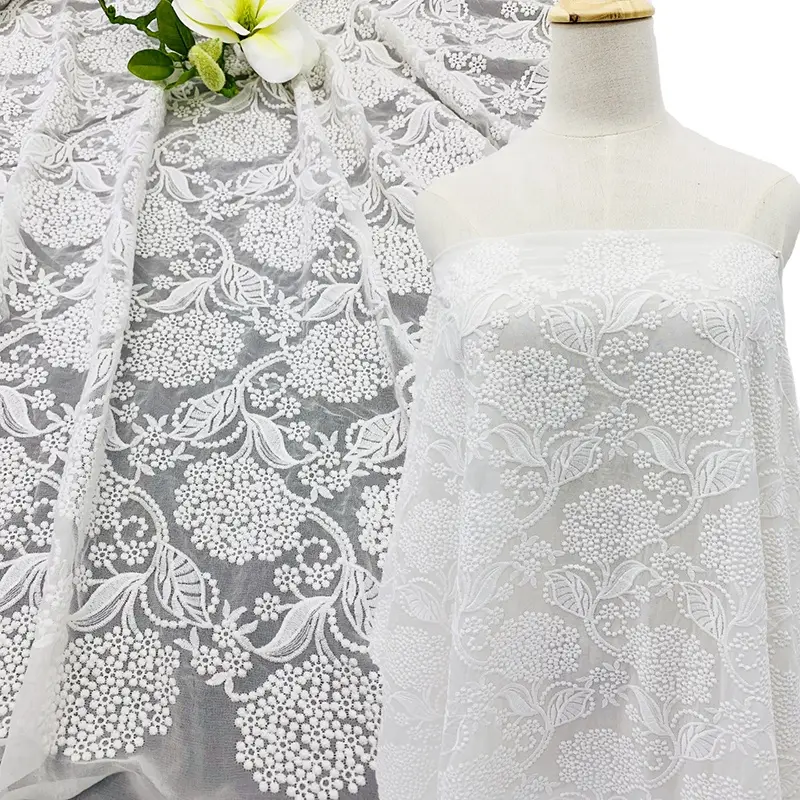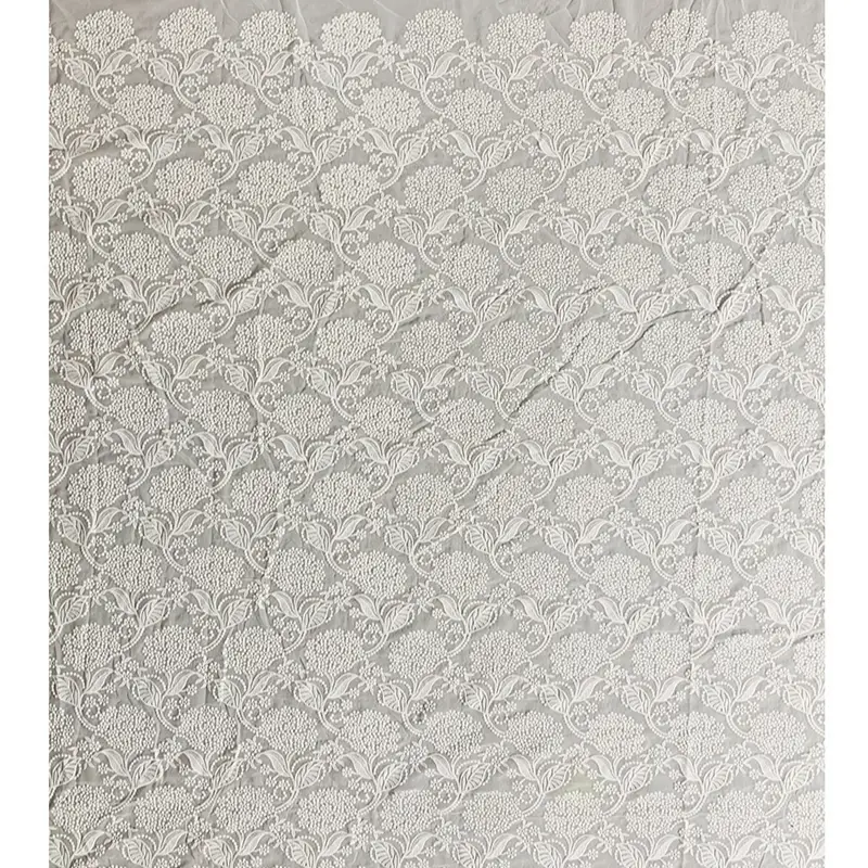 Manufacturer Wholesale Ivory White Polyester Floral Embroidered Chiffon Fabric.