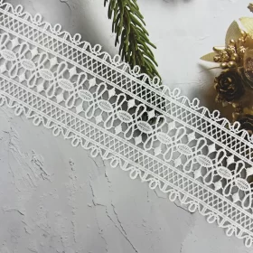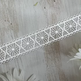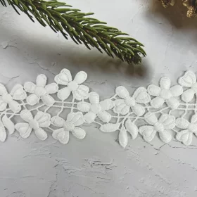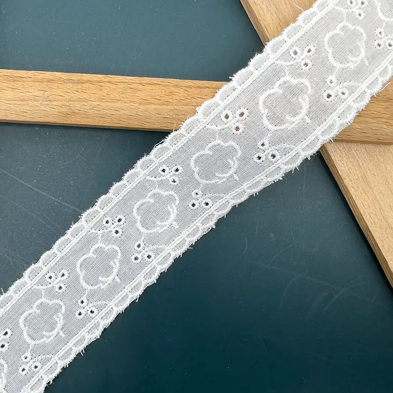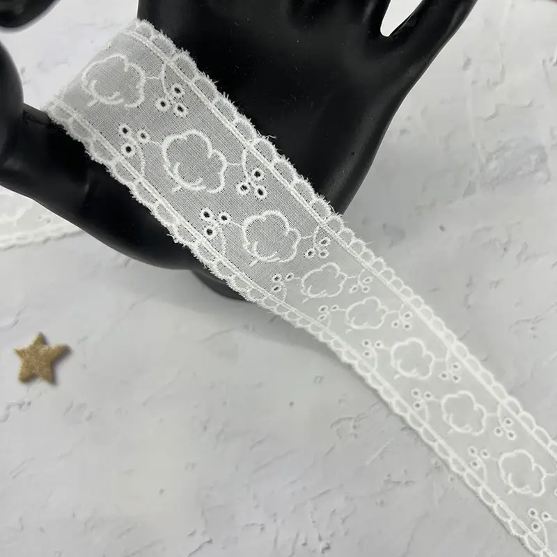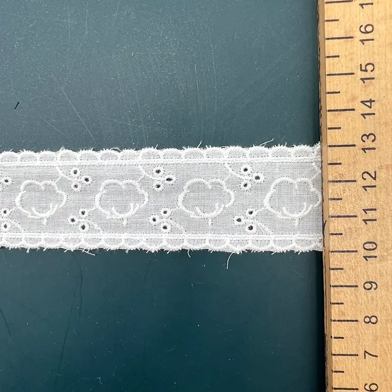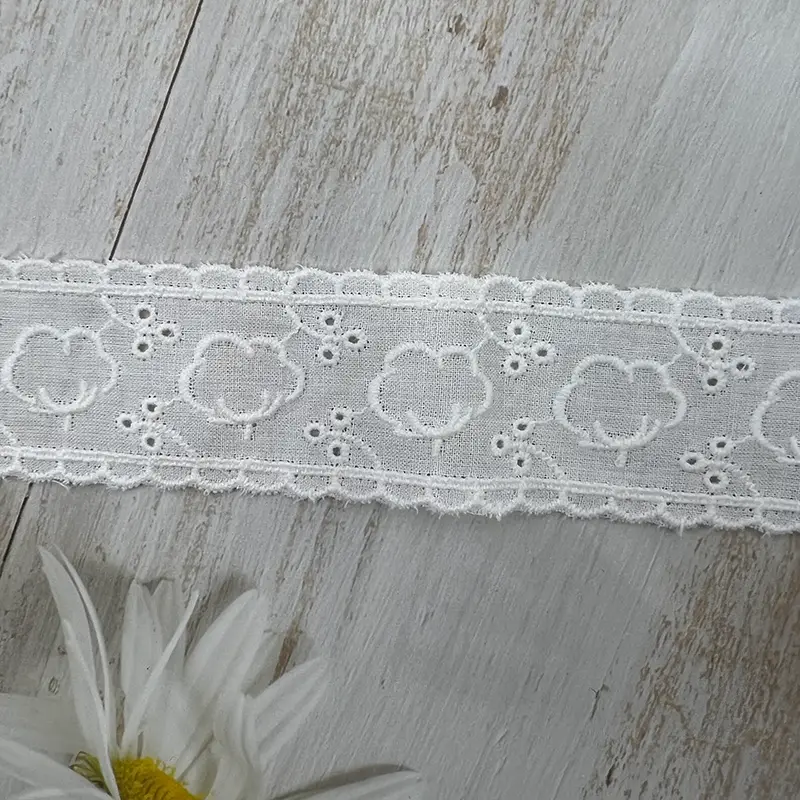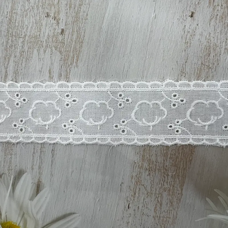 This 3.2CM white cotton eyelet lace trim features a charming floral motif combined with delicate cutwork and scalloped edges. The lightweight, breathable cotton base ensures a soft texture, while the neat embroidery enhances its playful yet elegant aesthetic, making it an ideal choice for refined designs.