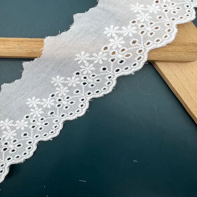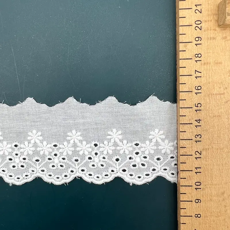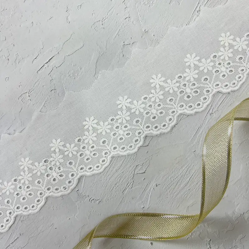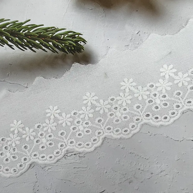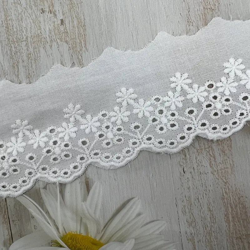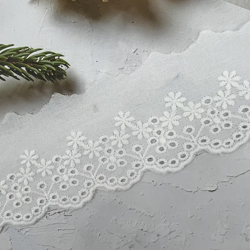 This 5.5CM white cotton eyelet lace trim features a charming daisy floral pattern with delicate cutwork and a softly scalloped edge. Made from high-quality breathable cotton, it offers a lightweight, smooth texture combined with intricate embroidery, delivering a fresh and lively aesthetic perfect for refined, natural designs.