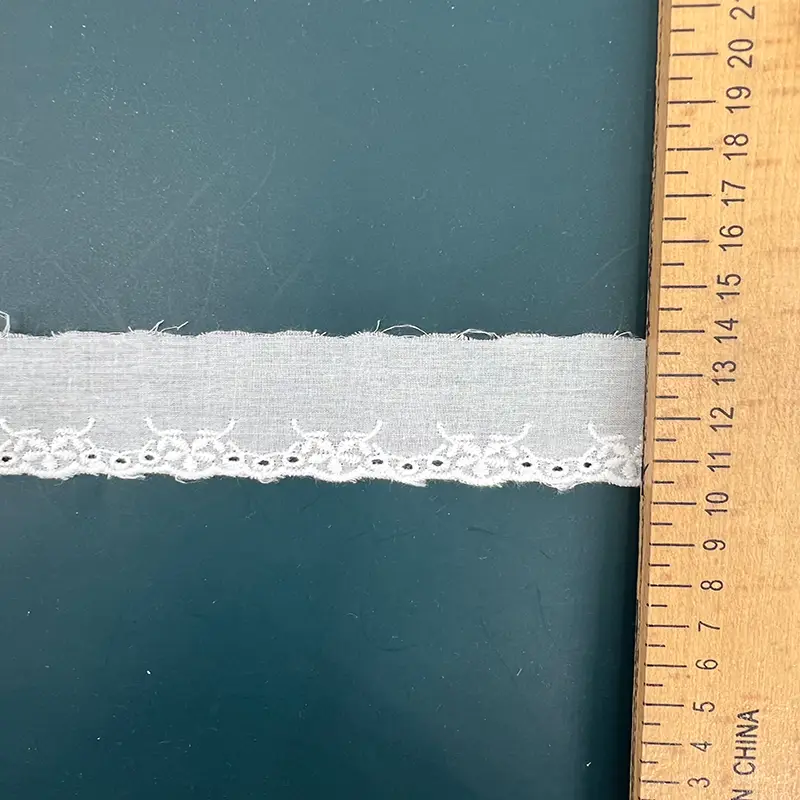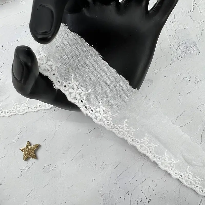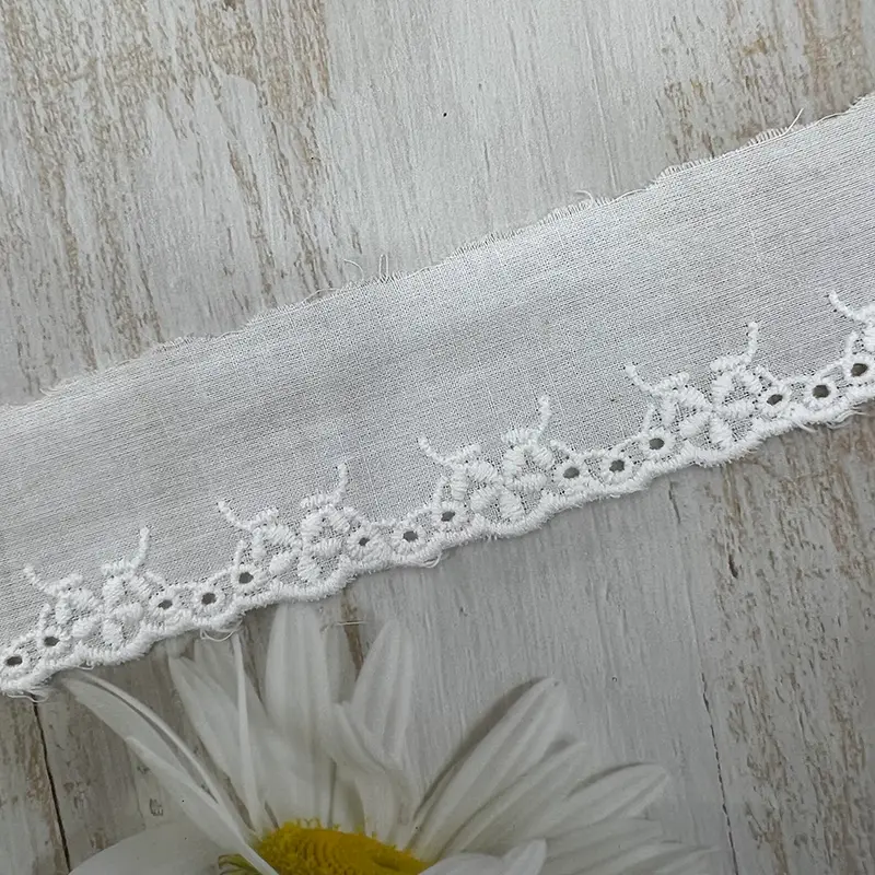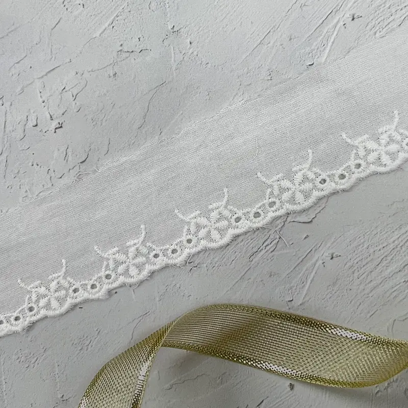 This 3.5CM white cotton eyelet lace trim features a refined floral embroidery pattern with delicate punched holes and scalloped edges. The lightweight cotton fabric and intricate design make it ideal for adding a touch of classic elegance to garments. Perfect for embellishing dresses, blouses, skirts, and children’s clothing, it provides a soft, breathable texture that enhances both style and comfort.