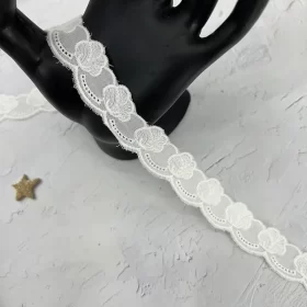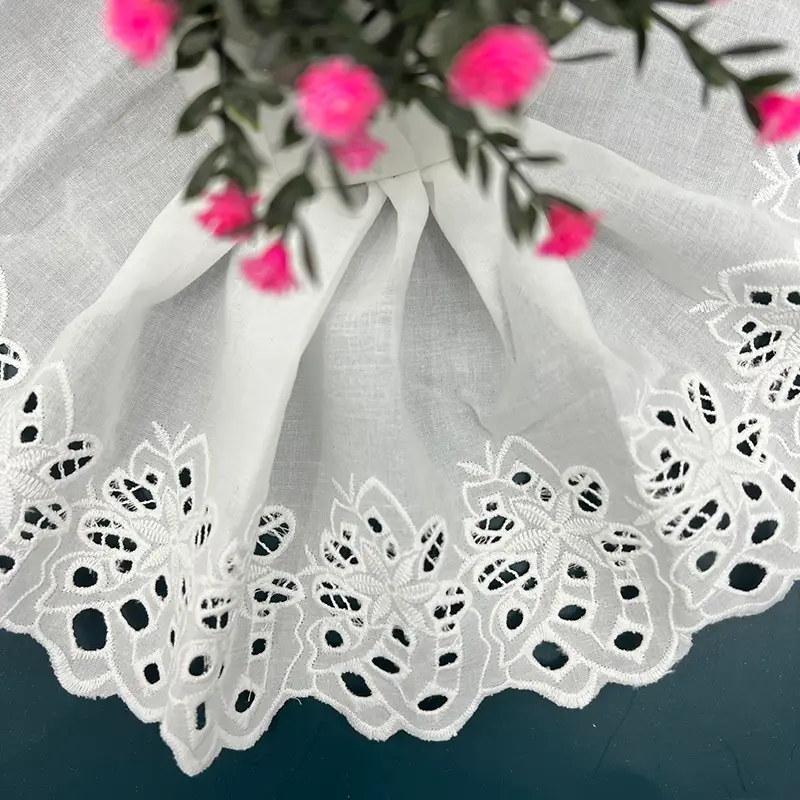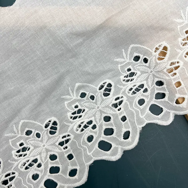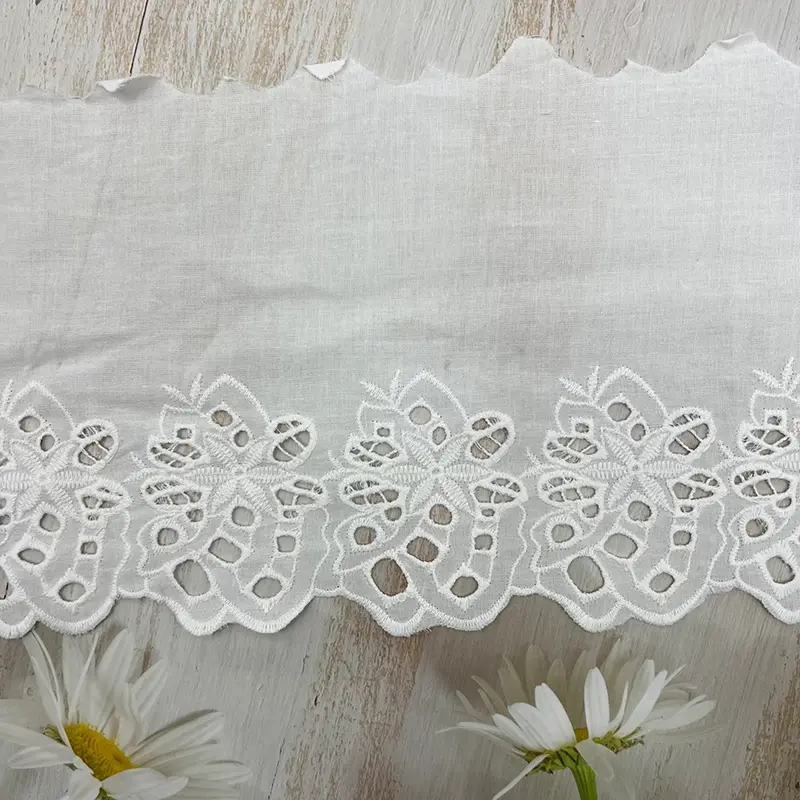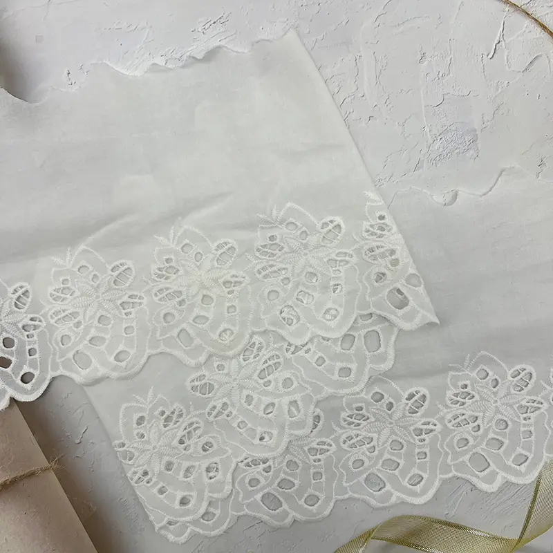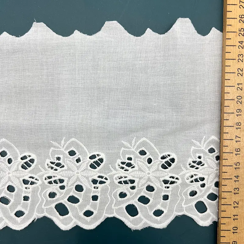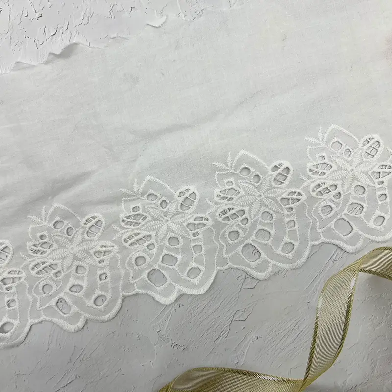 This 15CM white cotton eyelet embroidery lace showcases a delicate butterfly motif with intricate eyelet details, combining elegance and craftsmanship. The soft and breathable cotton fabric ensures comfort, while the scalloped edge enhances its aesthetic appeal, making it a standout choice for refined textile designs.