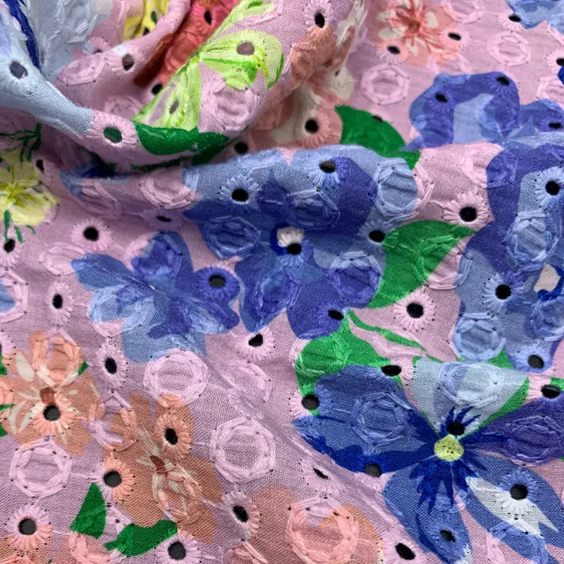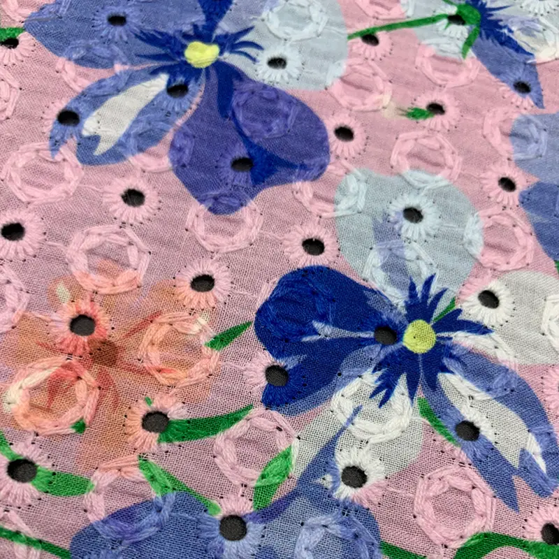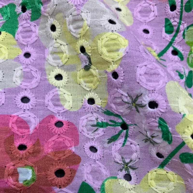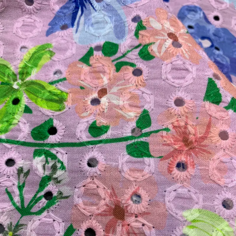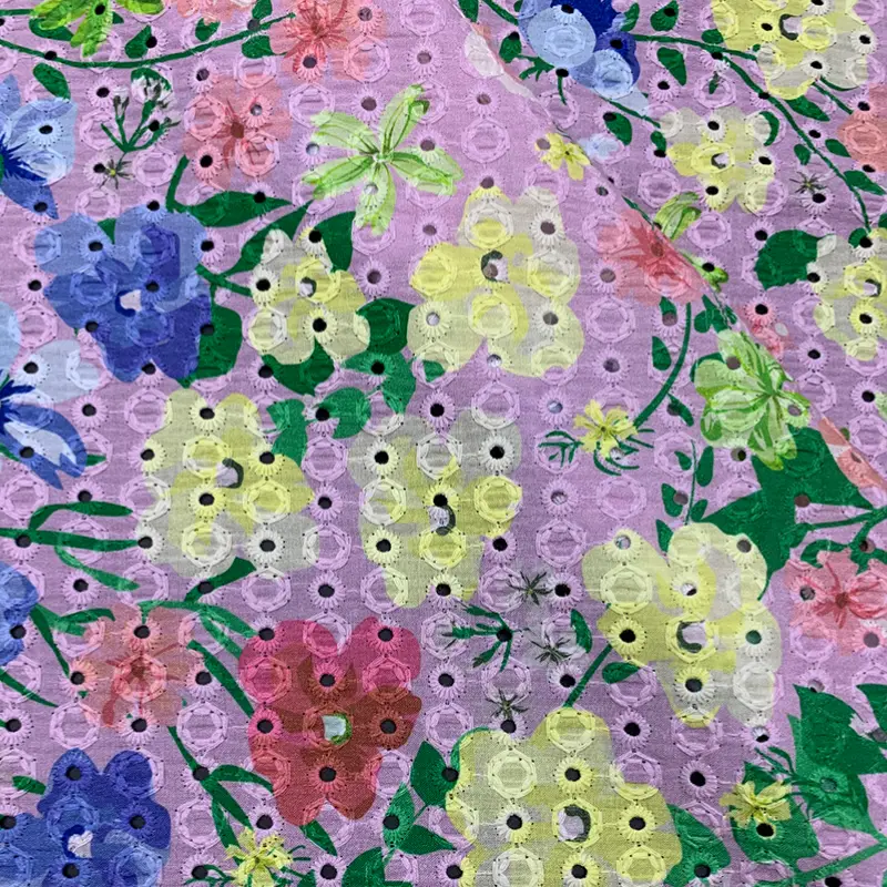 This fabric showcases a vibrant array of digitally printed florals on a soft lilac cotton voile base, combined with intricate eyelet embroidery. The playful yet refined design brings together bold, colorful blooms with delicate cut-out details, offering a unique blend of modern freshness and classic craftsmanship. The multicolor palette adds energy and visual depth, making the fabric truly eye-catching.