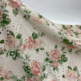 Crafted from premium cotton, this fabric offers a smooth, breathable texture with a soft hand feel. It has a light to moderate drape, allowing garments to flow naturally while maintaining enough structure for design versatility. The eyelet embroidery enhances the fabric’s dimensionality, making it both lightweight and airy — ideal for warm-weather wear.