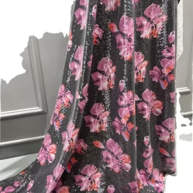 This fabric showcases a vibrant array of digitally printed florals on a soft lilac cotton voile base, combined with intricate eyelet embroidery. The playful yet refined design brings together bold, colorful blooms with delicate cut-out details, offering a unique blend of modern freshness and classic craftsmanship. The multicolor palette adds energy and visual depth, making the fabric truly eye-catching.
