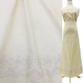 Ideal for summer dresses, blouses, and resort wear, this fabric’s delicate embroidery and breathable cotton base bring an effortless elegance to casual-chic and contemporary feminine collections.