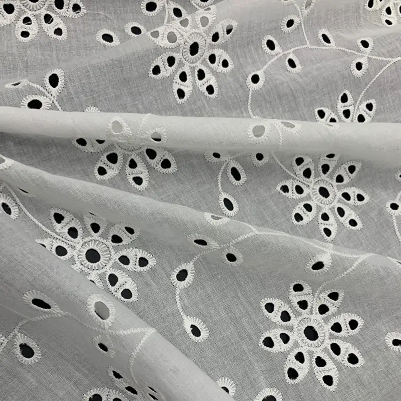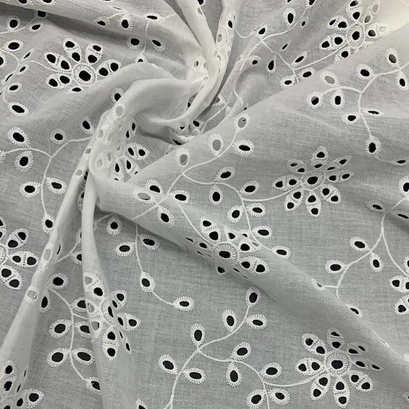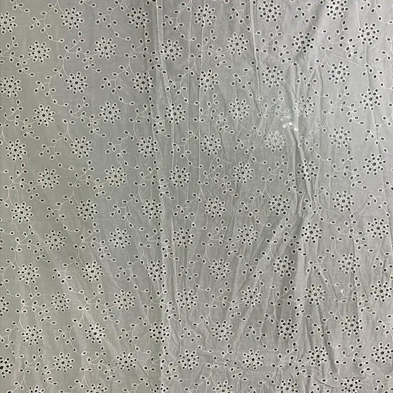 This floral eyelet embroidered cotton fabric features a graceful, vine-like flower motif with delicate cutwork accents. The balanced design layout offers a clean, fresh aesthetic perfect for both detailed and minimalistic garment concepts.