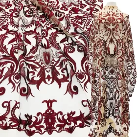Crafted from lightweight mesh with excellent drape, this fabric combines visual impact with wearable softness. Ideal for high-end fashion collections, it’s suited for creating standout evening gowns, outerwear accents, or runway-ready ensembles that demand attention. The skirt-border design makes it especially versatile for maxi dresses, kaftans, and dramatic overlay styles.
