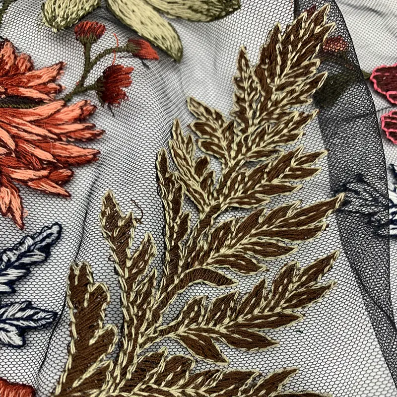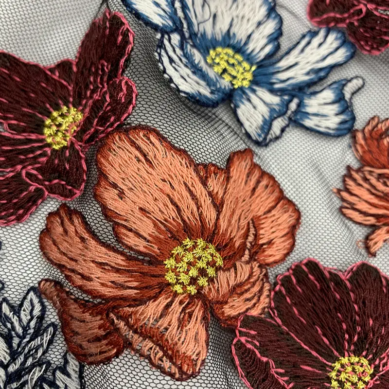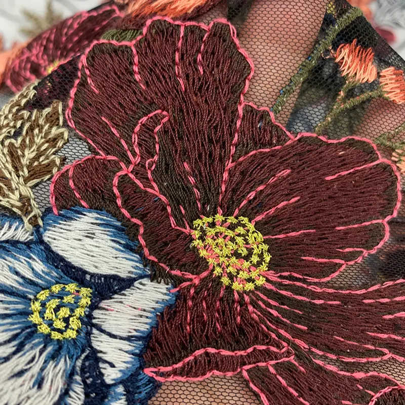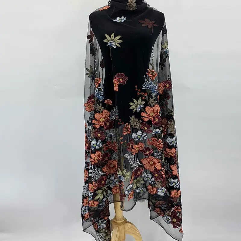Fashionable Multi-colored Floral Embroidered Tulle Fabric.
