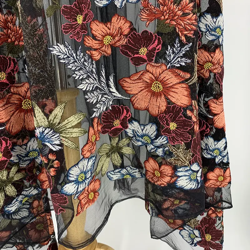 This multicolor floral embroidered mesh fabric showcases an exquisite mix of vivid flower and leaf motifs, rendered in rich, contrasting tones. The embroidery design is bold and full, with densely stitched blooms that bring a textured, dimensional look to the transparent black mesh base. The layout of the pattern includes an ornate border composition, perfect for creating statement hemlines or focal design details.