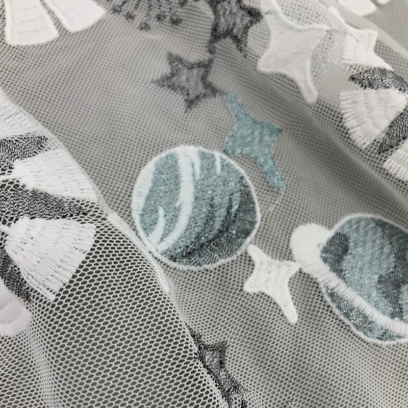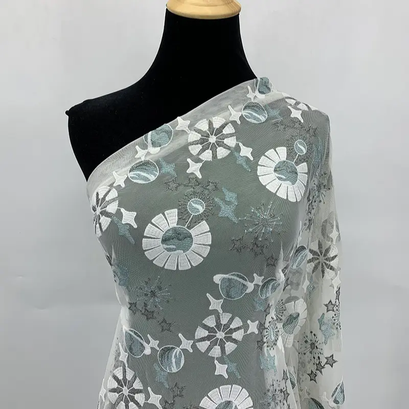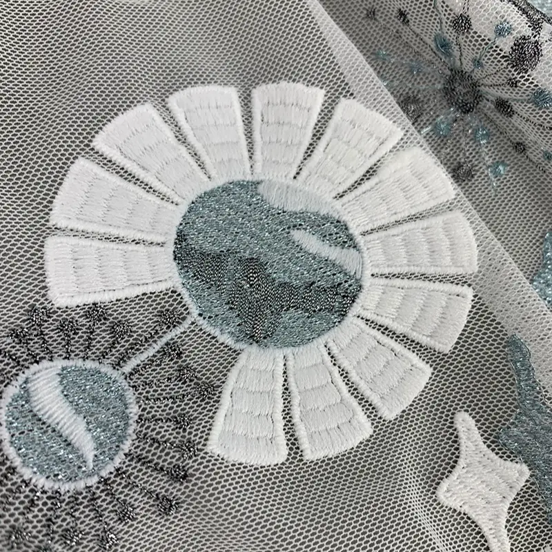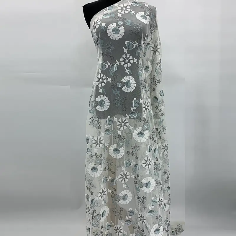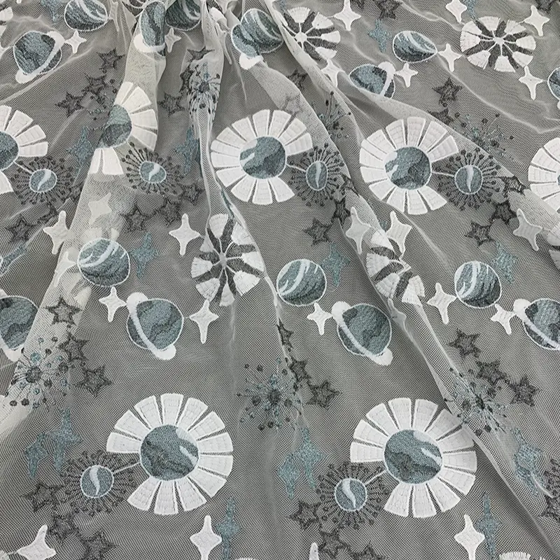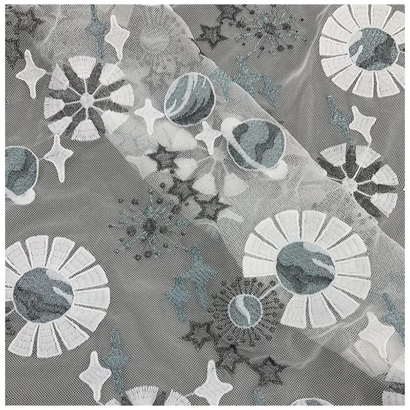 This whimsical embroidered mesh fabric features a dreamy cosmic theme with planets, stars, and abstract galactic motifs in a subtle palette of white, silver, and metallic tones. The large daisy-like floral centers juxtaposed with orbiting celestial shapes create a playful yet futuristic aesthetic that feels both artistic and fashion-forward.