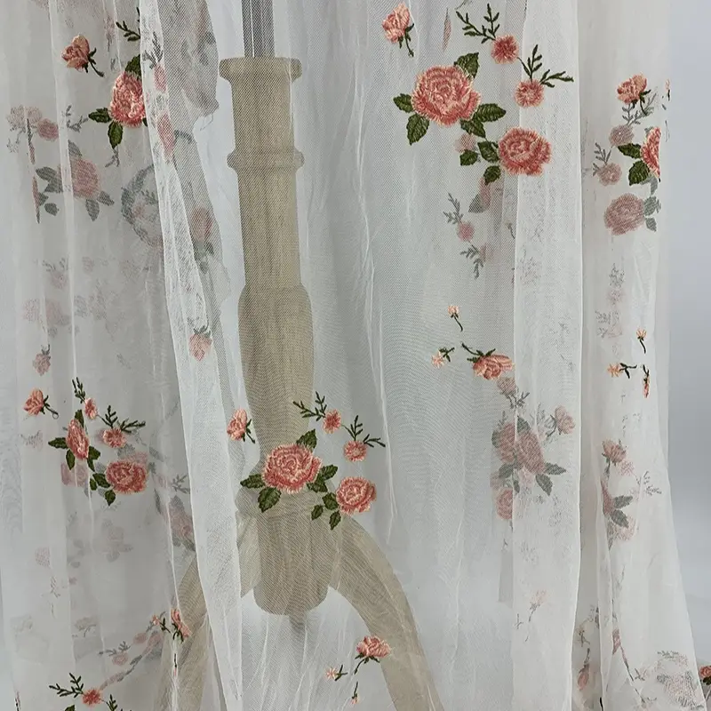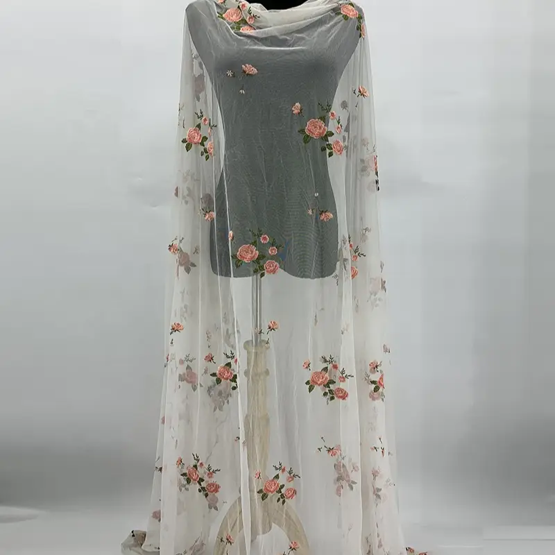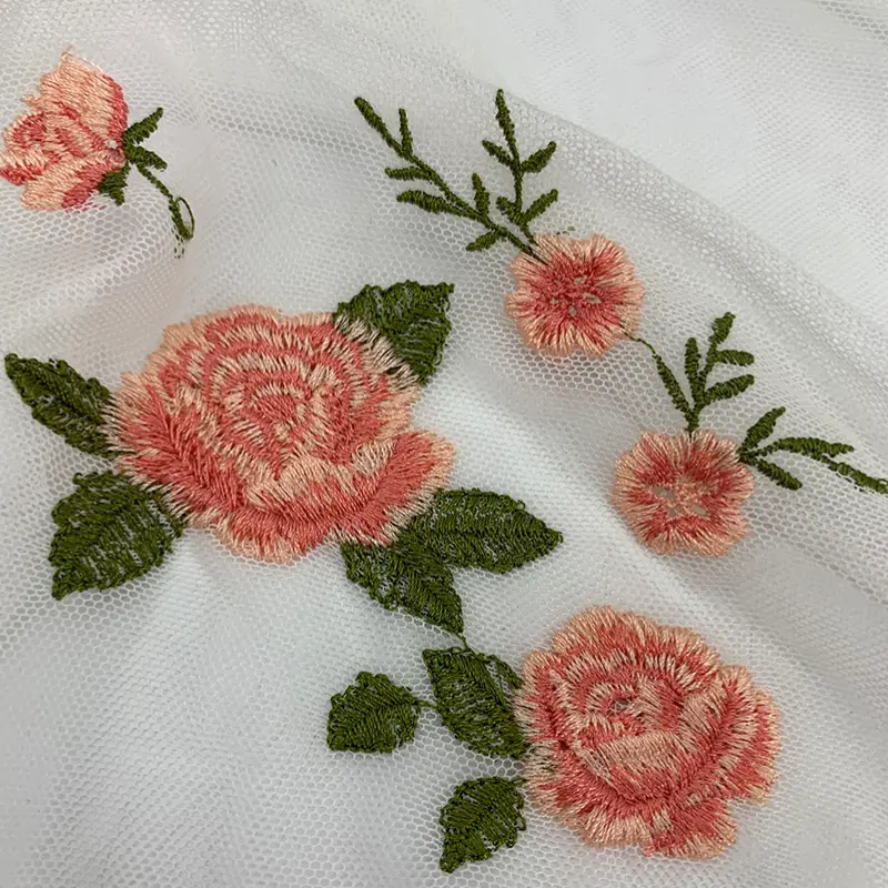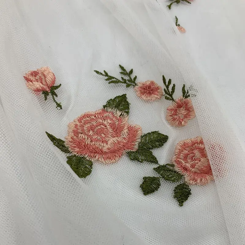 This fabric features a delicate arrangement of rose motifs embroidered in soft shades of peach and green on a sheer, lightweight mesh background. The floral designs are spaced thoughtfully to create an airy, elegant layout, offering a fresh and romantic aesthetic that highlights the fine craftsmanship of the embroidery.