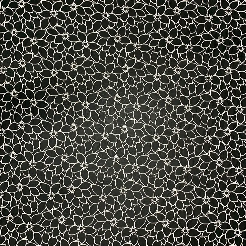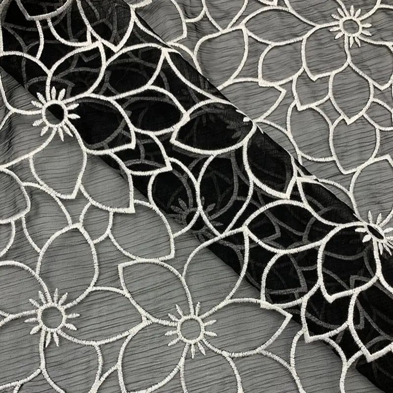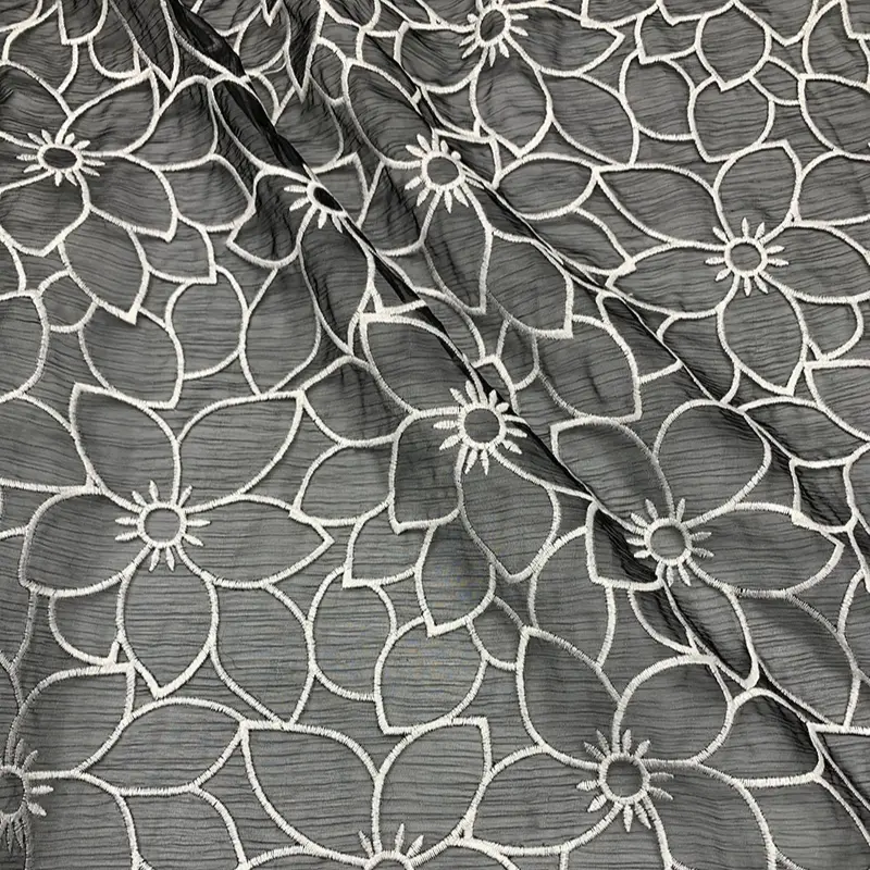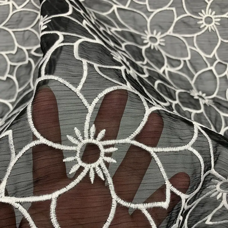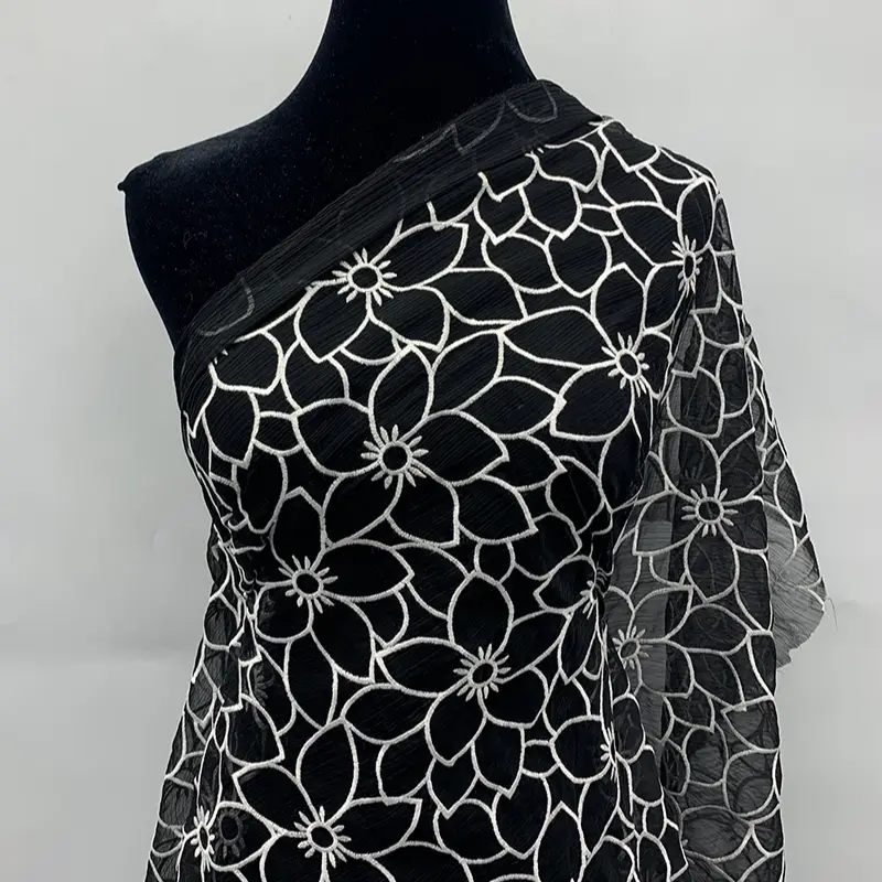 This fabric features an eye-catching oversized floral embroidery design stitched in fine white milk silk thread against a deep black crinkle chiffon base. The bold flower outlines create a modern, graphic effect while maintaining a balance of delicacy and strength, perfect for adding a statement element to any garment.