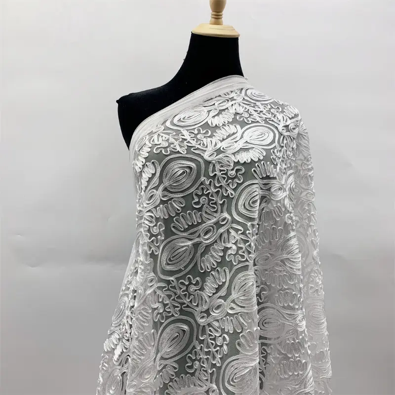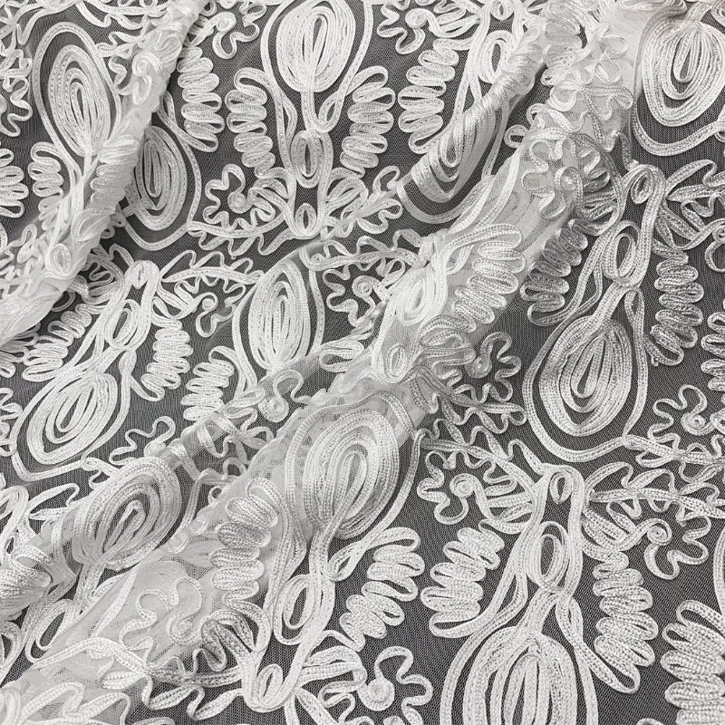 Hot Design Ivory White Floral Cord Embroidered Mesh Fabric.
