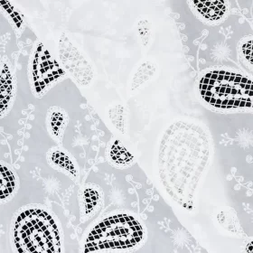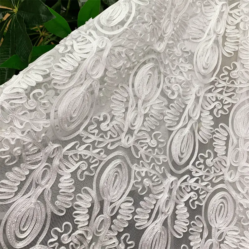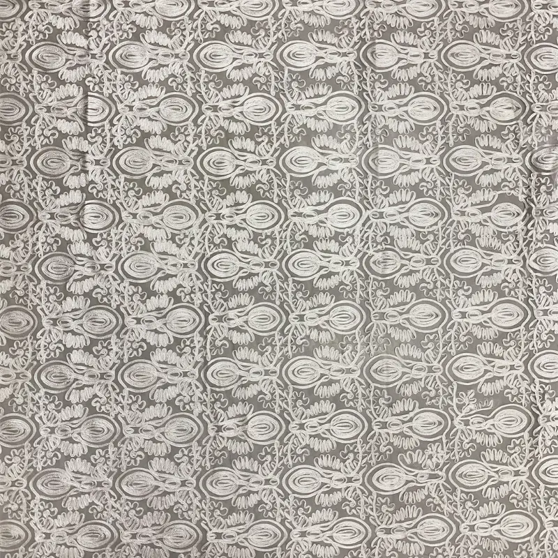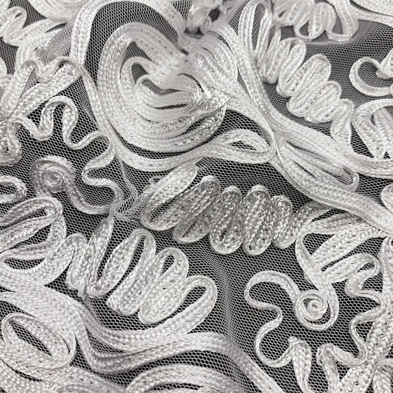 This fabric features an artistic corded embroidery design on a lightweight mesh base. The pattern combines free-flowing, abstract botanical elements with looped stitching, creating a rich, dimensional texture. The irregular rhythm and fluidity of the lines offer a fresh, modern interpretation of traditional embroidery.