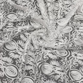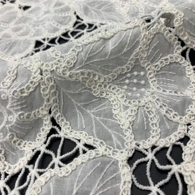 This fabric features a sophisticated floral motif created through a combination of precise laser-cut techniques and intricate cotton cord embroidery. The large flower and leaf patterns are delicately connected by fine connection lines, offering an elegant openwork effect that adds texture and dimension.
