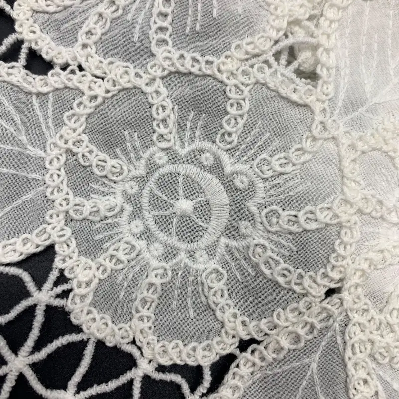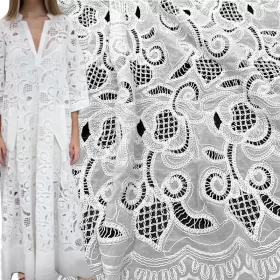 Crafted from soft cotton voile, the fabric maintains a natural hand feel with moderate body and excellent breathability. The embroidery provides a structured look while the fabric still retains enough fluidity for graceful draping, making it suitable for both casual and refined silhouettes.