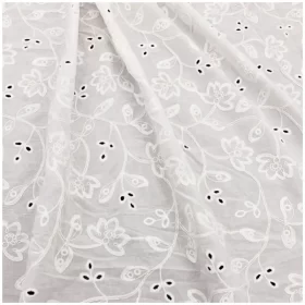 Crafted from soft cotton voile, the fabric maintains a natural hand feel with moderate body and excellent breathability. The embroidery provides a structured look while the fabric still retains enough fluidity for graceful draping, making it suitable for both casual and refined silhouettes.