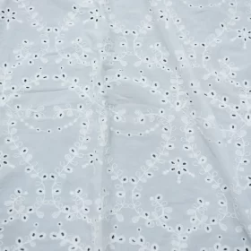 Crafted from soft cotton with fine corded stitching, this fabric offers a breathable and skin-friendly texture. It has a natural drape and medium weight, allowing for both comfort and body in finished garments. The embroidery holds its shape well, providing just enough structure without stiffness.
