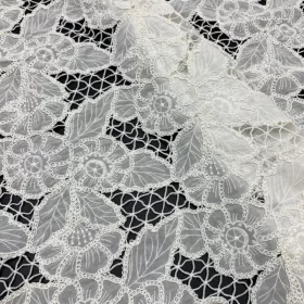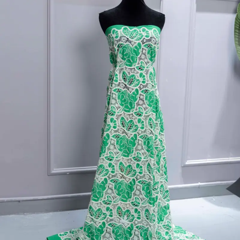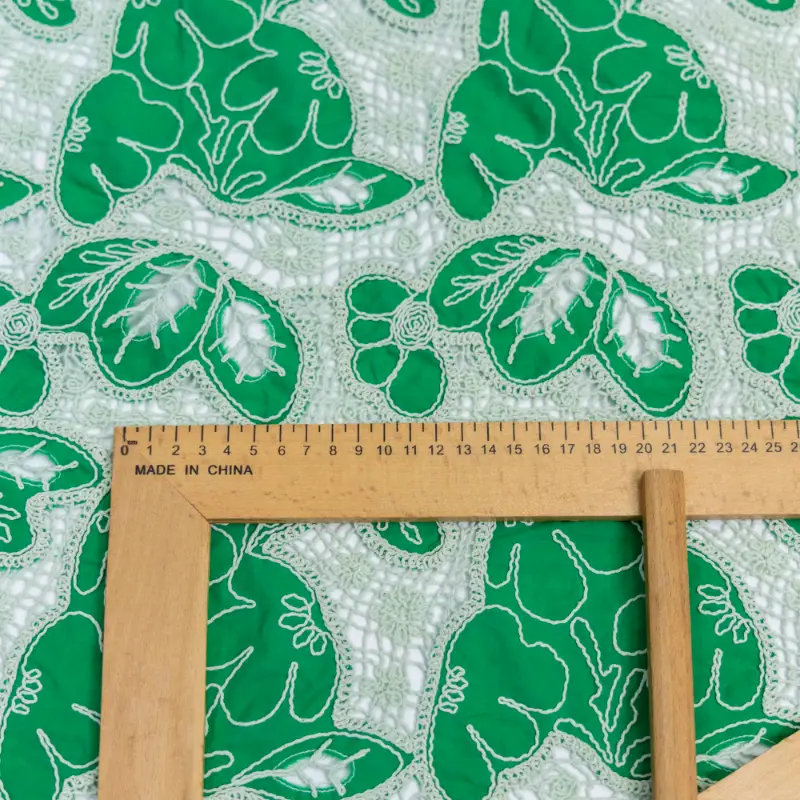 This vibrant cotton cord embroidery fabric features a laser-cut floral motif over a contrasting colored cotton base. The intricate design showcases dimensional, leaf-like patterns connected by intricate network in guipure embroidery, creating a striking blend of structure and delicacy. The color contrast enhances the visual depth, making the embroidery pop beautifully.