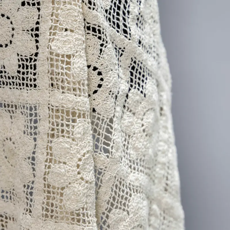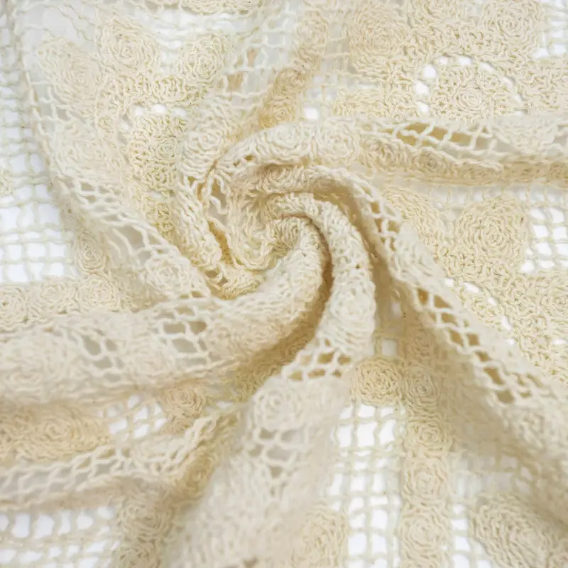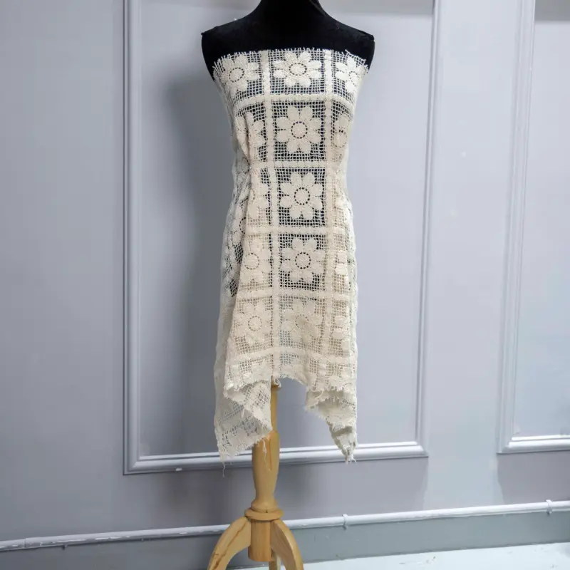 The fabric offers a soft texture and moderate drape, giving garments a graceful yet defined silhouette. The openwork lace structure ensures breathability, while the embroidery adds a tactile richness and dimensional quality.